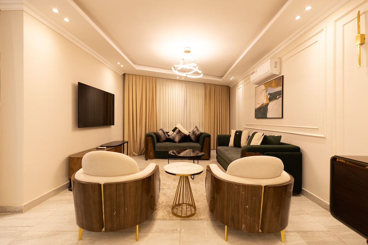 Welcome to our modern 3BR (200 sqm) hotel apartment by West Somid Developments! Designed for families, groups & professionals. Enjoy 5G Wi-Fi, 4 smart TVs, electric shutters & new furniture. 24/7 security, guest lobby, food delivery & optional cleaning. Guests can also enjoy a shared rooftop lounge — great for movie nights, relaxing evenings & family time. Just minutes from Mall of Arabia & top Zayed spots! ما نقدر نستضيف أي ثنائي عربي غير متزوج في نفس الشقة.