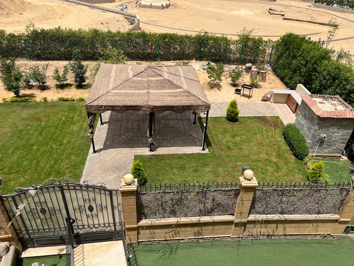 Stay in a spacious 4-bedroom villa in the heart of Egypt’s 6th of October City, within a gated community offering 24/7 security. Surrounded by mango, grapefruit, and lemon trees, this villa offers a refreshing garden view and a peaceful escape from the city — while keeping you close to some of Egypt’s most iconic landmarks. Perfect for families and groups of friends, the villa comfortably hosts up to 7 guests. Only a 20-minute drive to the Pyramids of Giza and the new Grand Egyptian Museum.