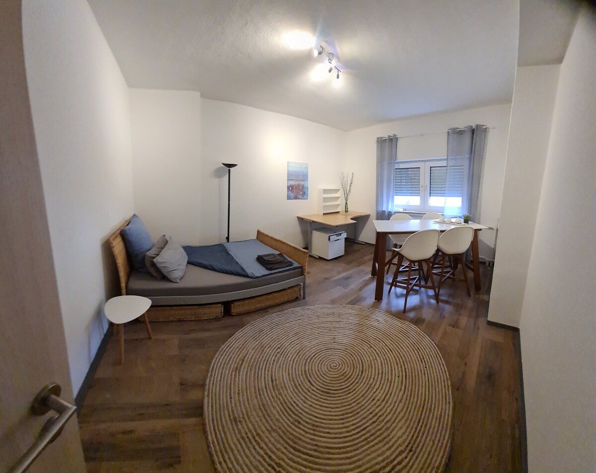 Całodobowe samodzielne zameldowanie/wymeldowanie, łóżko, rower i więcej, nowe własne całe 13 m² zakwaterowanie na parterze, oddzielny dostęp, ciche, 1 podwójne/pojedyncze łóżko, mała łazienka (prysznic 1,2 x 0,8), umywalka + toaleta) mała kuchnia z lodówką, kuchenką mikrofalową z piekarnikiem, biurkiem z krzesłem, elektrycznym fotelem wypoczynkowym, stołem, 2 krzesłami, wieszakiem na ubrania + półkami, Telewizja kablowa + Alexa, Parking, Wi-Fi + rowery gratis, 350 m Aasee, -Bäcker, 550 m supermarket. 3 km miasto, 400 m-A1/A43, 20 m przystanek autobusowy, miasto + uniwersytet: 12 min