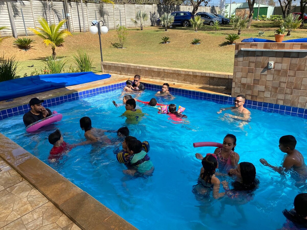 Império Espaço to prywatne miejsce na pobyt w Abadia de Goiás, około 20 minut od Goiânia. Oferuje basen, w pełni wyposażoną część dla smakoszy, klimatyzowaną sypialnię i prywatny parking, zapewniając komfort, bezpieczeństwo i spokój. Idealne na rodzinne weekendy, odpoczynek lub małe spotkania, a także doskonała opcja na pobyt w czasie ważnych wydarzeń w stolicy, np. na torze wyścigowym Goiânia.