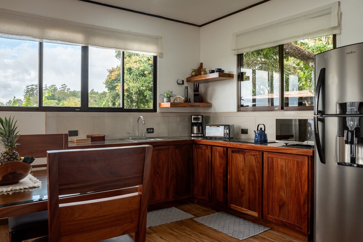 Witaj w spokojnej kryjówce w lasie mglistym Monteverde na Kostaryce Przytulne i otoczone przyrodą, idealne na odpoczynek i podziwianie niezapomnianych zachodów słońca Obudź się przy śpiewie ptaków, wypij poranną kawę z panoramicznym widokiem i zakończ dzień złotym niebem z tarasu Co sprawia, że Twoje miejsce jest wyjątkowe? • Widoki na zachód słońca z prywatnego tarasu • W pełni wyposażona kuchnia do przygotowywania posiłków • Szybkie Wi-Fi do pracy lub streamingu • Bezpieczne, prywatne i w pobliżu najlepszych atrakcji; Idealne dla par, podróżujących w pojedynkę i miłośników przyrody