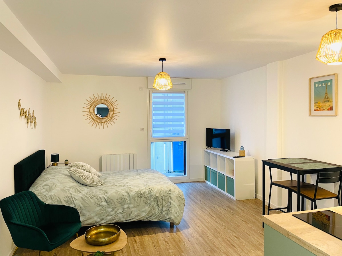 Chcesz uciec w Normandii... Witamy w "Lakaz Créole", uroczym funkcjonalnym studiu świeżo odnowionym i idealnie położonym w zabytkowej okolicy Caen, gdzie urok kamiennych i zielonych przestrzeni na piękne spacery... Dotrzyj do słynnej dzielnicy Vaugueux i Chateau de Caen, portu i wielu tarasów w 10 minut pieszo, przechodząc przez piękny Parc d 'Ornano i Abbaye aux Dames... Czekamy na Ciebie!