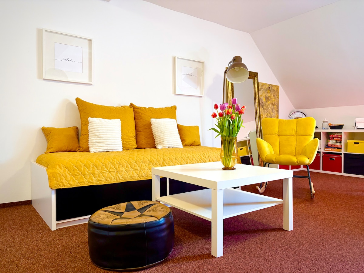 Ten stylowo urządzony apartament położony jest bezpośrednio na górze, w otoczeniu zieleni, na obrzeżach Schwarzenberg. Czeka na Ciebie spokój, czysta przyroda i zapierające dech w piersiach widoki na Rudawy. Miłego pobytu dla par lub rodzin. Apartament znajduje się na pierwszym piętrze i można do niego dojechać windą. Szybkie Wi-Fi i parking są bezpłatne. Ręczniki i pościel są w cenie. Miłego pobytu!