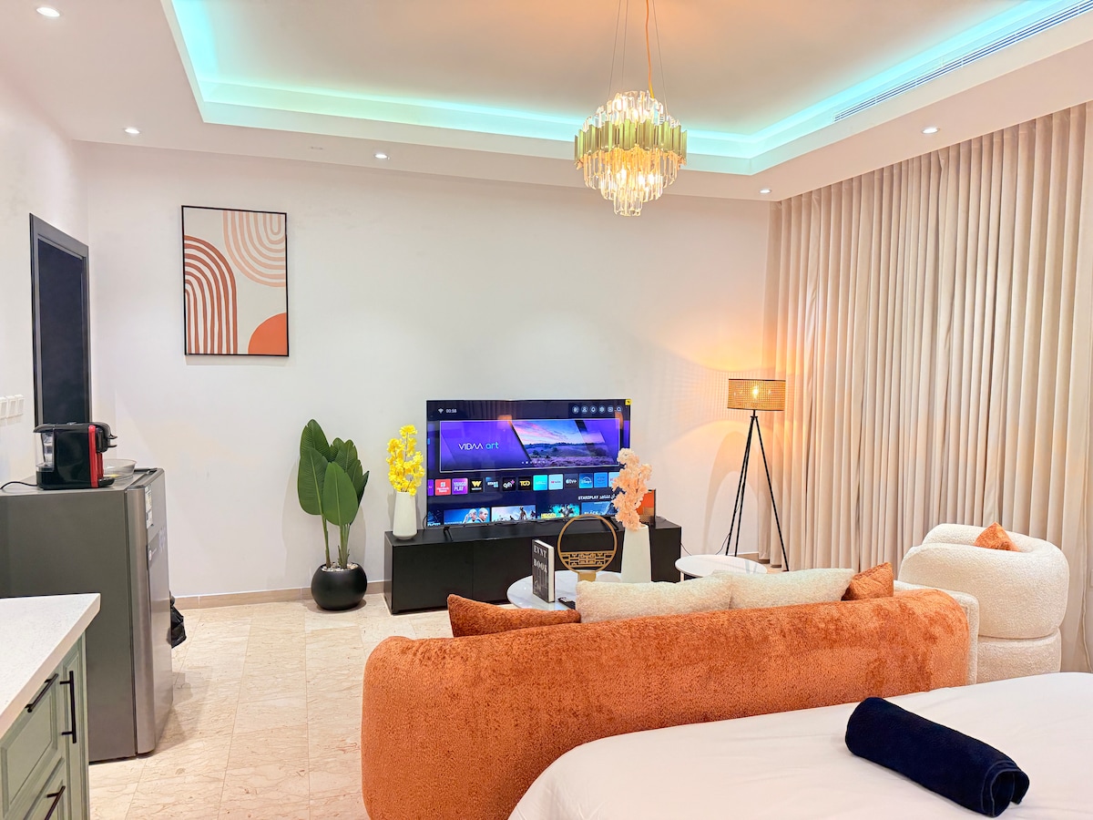 Welcome to our cozy private studio, designed for your comfort. 🚪Enjoy the convenience of Self Check-in with a smart keypad. Enjoy 5G wifi and a 75-inch TV with Netflix, Shahid, and YouTube Premium The bathroom is stocked with essentials like towels, soap, shampoo, and body wash for your convenience. Just a minute away, you'll find everything you need such as a mini-market, laundry service, barber shop, and restaurant