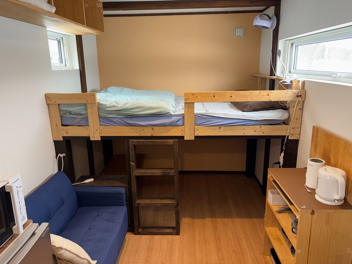 Zatrzymuję się w małym domku! Niseko Resort znajduje się 15 minut jazdy, a Rusutsu Resort – 20 minut jazdy. Cały budynek jest typu wynajmowego, co sprawia, że jest to bardzo ciche i relaksujące miejsce z lasem przed Tobą. Sama przestrzeń jest kompaktowa, ale funkcjonalna Biorąc to pod uwagę, kompaktowa i rozsądna cena jest również atrakcyjna. Myślę, że jest również idealne na dłuższy pobyt. Używaj go do baz narciarskich i snowboardowych. W sezonie letnim można również grillować. Korzystanie z kącika grillowego wiąże się z oddzielną opłatą w wysokości 1500 jenów. W skład wyposażenia wchodzi kuchenka, krzesła i stół.Daj nam znać, kiedy dokonasz rezerwacji. W sezonie letnim znajduje się tu również trampolina, slackline itp. Sezon letni trwa od maja do połowy października. Jest toaleta, prysznic, umywalka, kuchenka mikrofalowa, lodówka, kuchenka gazowa, tifal, Wi-Fi i proste przybory kuchenne. Właściciel jest również wielkim miłośnikiem snowboardingu, więc myślę, że można również uzyskać informacje o ośrodku narciarskim. Dziękujemy!