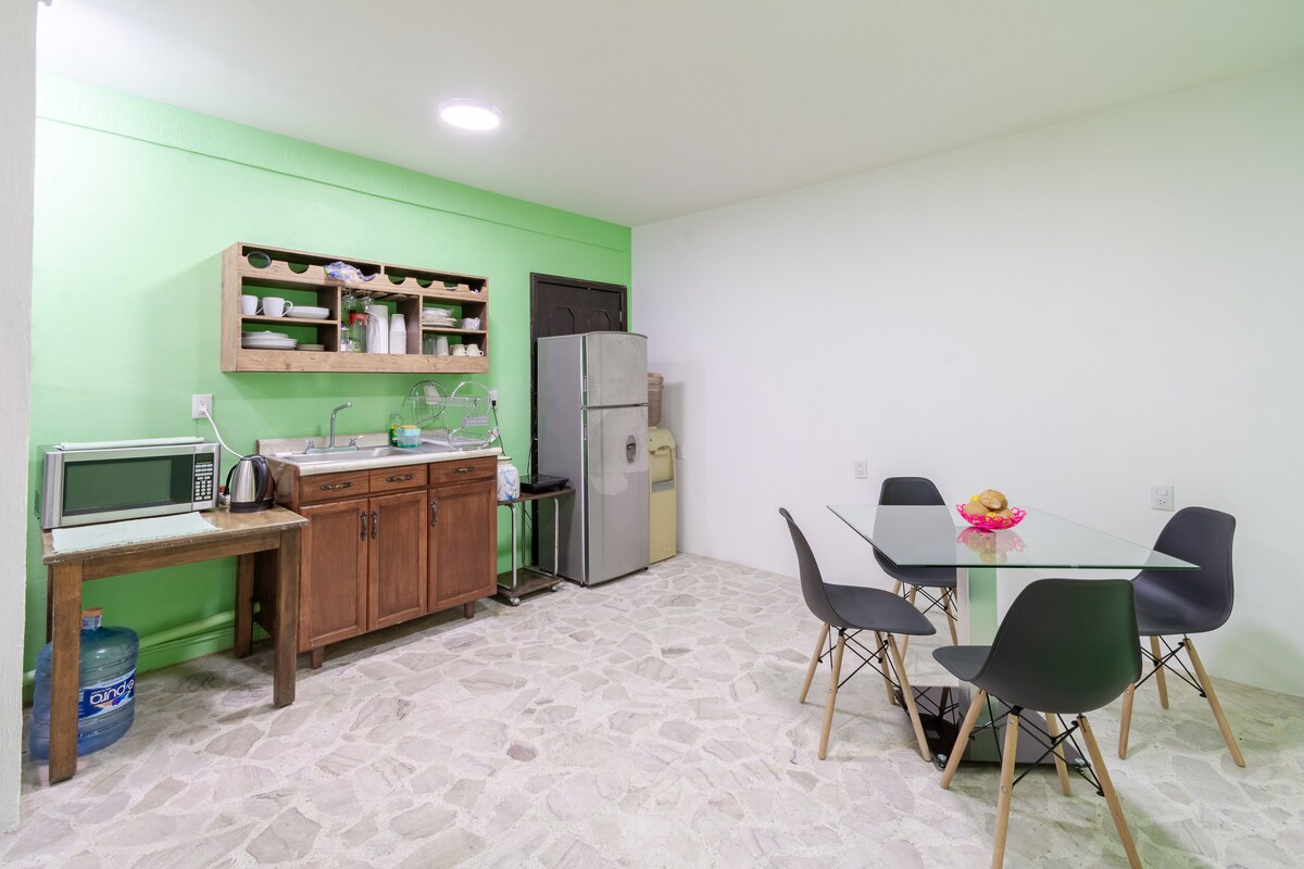 Odkryj nasz apartament w centrum Acámbaro. Nasze mieszkanie jest wygodne i prywatne, idealne do odpoczynku lub pracy. Posiada dwie sypialnie z podwójnym łóżkiem, jadalnię i w pełni wyposażoną kuchnię. Korzystaj z usług oświetlenia, internetu i gorącej wody przez 24 godziny na dobę, a także z monitoringu. Zameldowanie i wymeldowanie są elastyczne, wystarczy tylko uzgodnić szczegóły. Cieszymy się, że możemy Cię powitać!