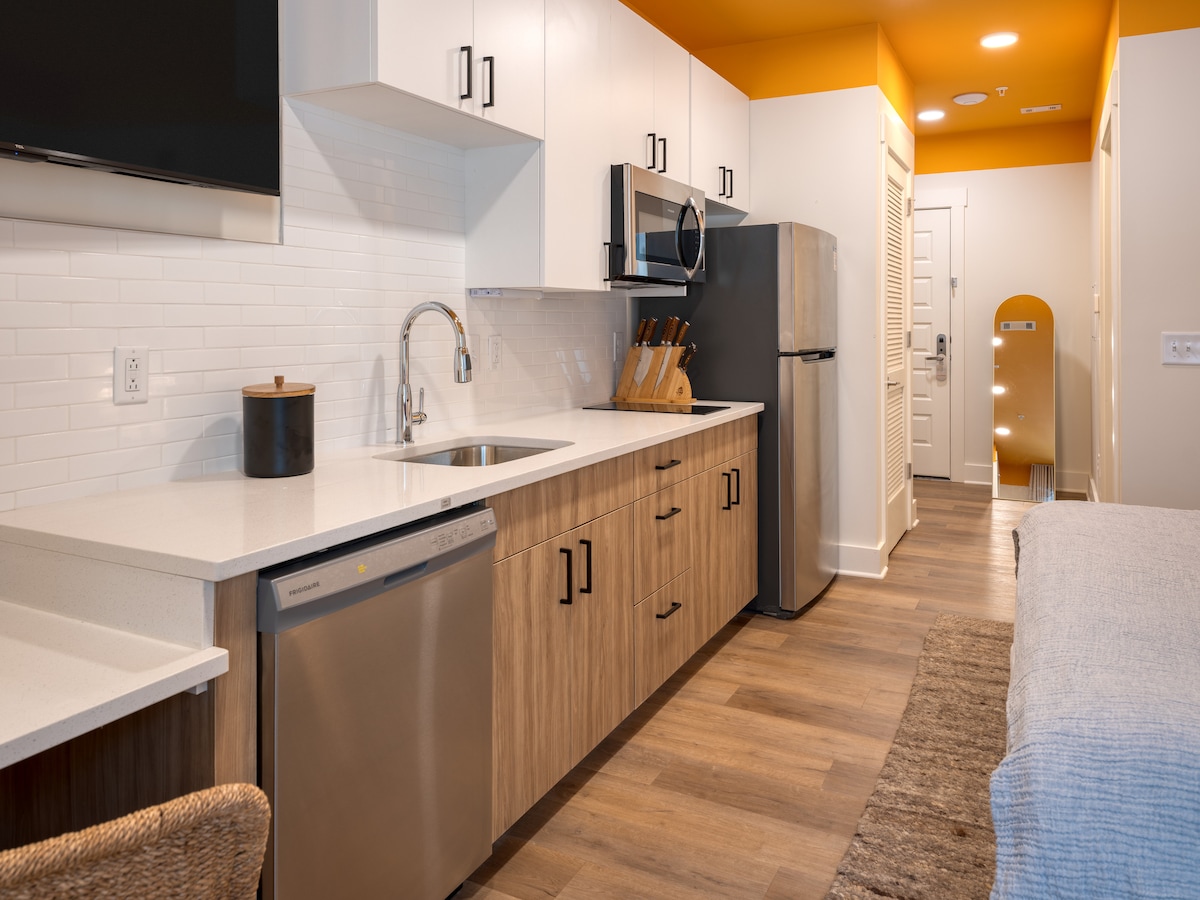 Zatrzymaj się w The Gilmore, najwyżej ocenianym hotelu w Nashville, gdzie styl europejski spotyka się z urokiem Południa w samym sercu dzielnicy 12 South. Nasz hotel został otwarty w maju 2025 roku i z dumą informujemy, że zajmuje pierwsze miejsce wśród 230 hoteli na TripAdvisor. Przestrzeń * Nasze Deluxe King Studios oferują: * Pluszowe łóżko typu king, zasłony zaciemniające i szlafroki * Pełna kuchnia z kuchenką, lodówką, mikrofalówką i Nespresso * Smart TV, miejsce do pracy i luksusowe przybory toaletowe * Taras na dachu + dostęp do prywatnego ogrodu na dziedzińcu * Konsjerż i usługi wellness w pokoju