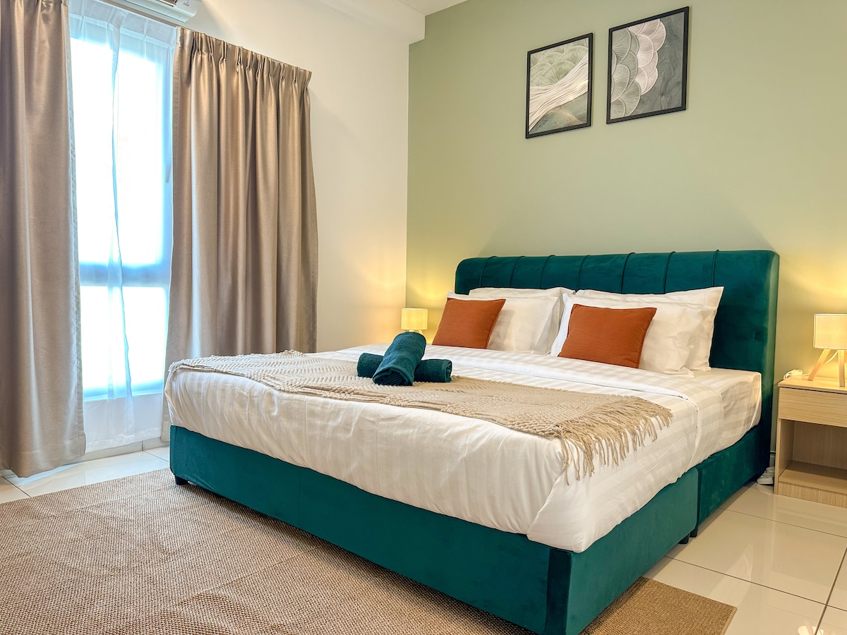 Aldridge Residence (Resort inspired) @EMIRA RESIDENCE opposite AEON Mall. Our newly enhanced suite build with 1 bedroom and 2 toilets. Full air conditioner upscale apartment with superb facilities & amenities. Equip with sofa bed, water heaters, fridge, microwave, hair dryers, water filter, 4K LED TV, and complimentary coffee & tea & 2 parking spaces for your own convenient. *Sofa bed comfortably sleep for 2 guests. Aldridge Residence; feel like a hotel, feel like a home.