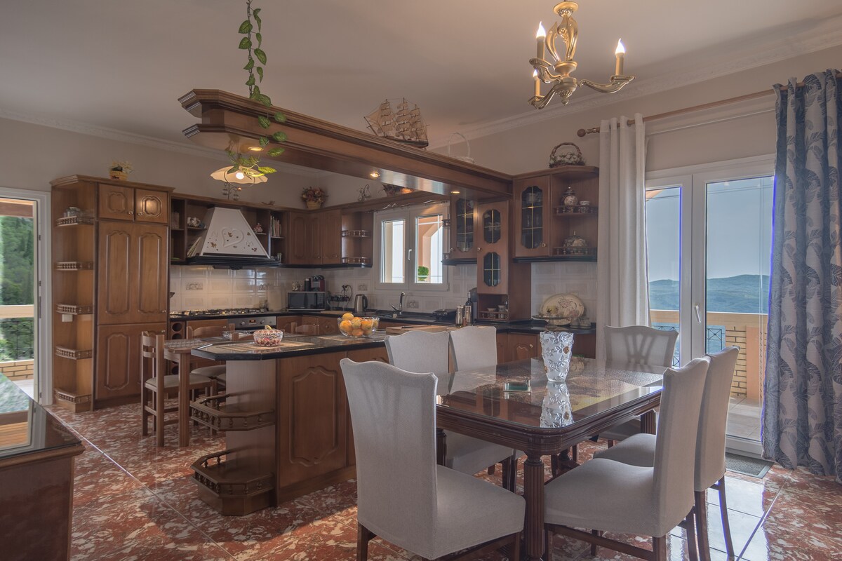 Villa Maria with sea view is located in the northwest of the island of Corfu in the picturesque mountain village of Krini, which is a popular destination for hikers (walking tour to the Angelokastro). The spacious Corfu Villa Maria, designed for up to 7 people, has 4 bedrooms, 2 bathrooms, a large living/dining room and a modern kitchen as well as 2 balconies. The upscale equipment includes a dishwasher, a washing machine, a flatscreen TV , broadband internet (WLAN),and air conditioning.
