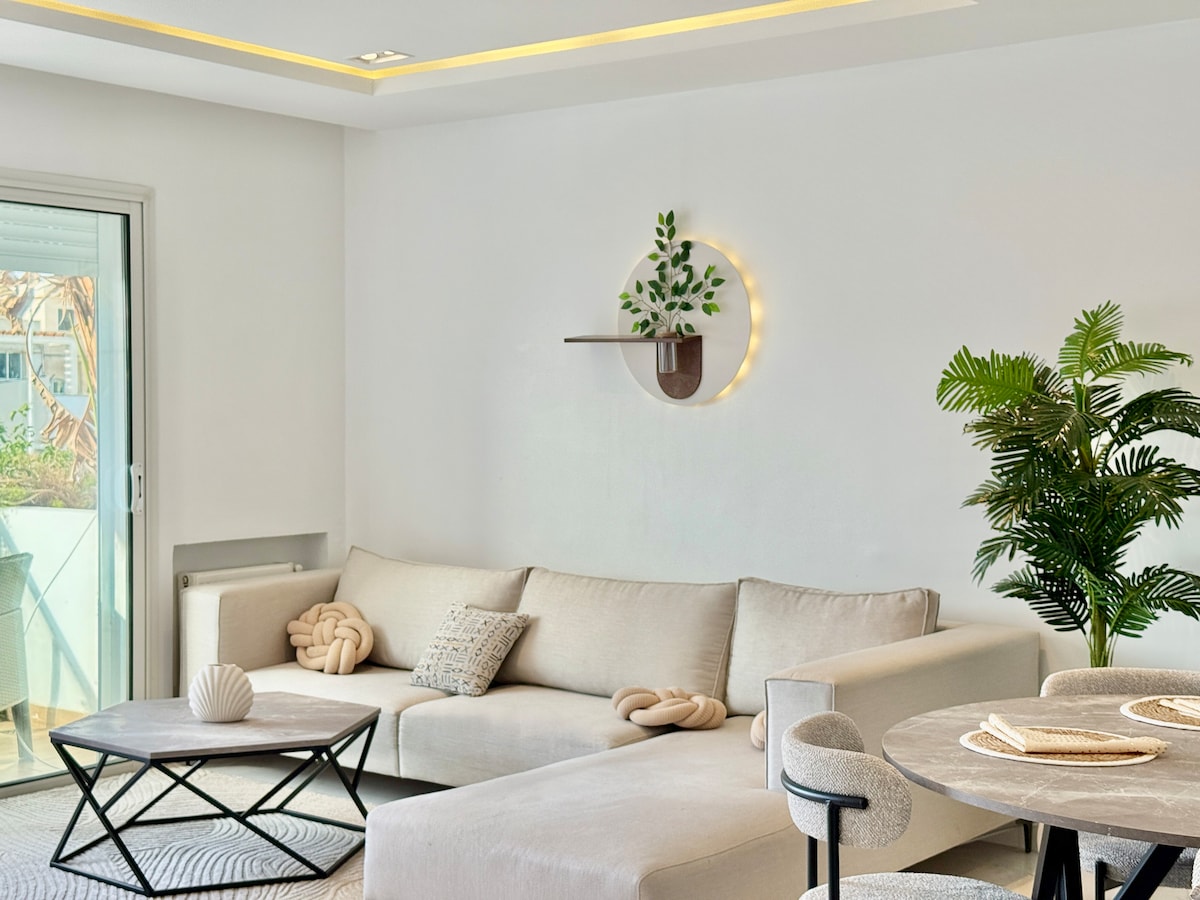Relax in this quiet and elegant accommodation located in Ain Zaghouan Nord La Marsa. A beautiful, fully furnished apartment. Fully equipped kitchen open to the living room. Living room with 50-inch smart TV and Netflix subscription available. Spacious bedroom with a large queen size bed and large wall-mounted dressing room for more storage. A superb dressing table equipped with a pouf to make yourself look beautiful before heading out for the evening. An outdoor terrace that leaves you amazed