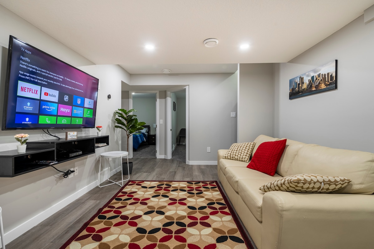 ✨ Nowoczesny apartament z 1 sypialnią w South Airdrie ✨ Zrelaksuj się w nowo wybudowanym prywatnym apartamencie w piwnicy z przytulną sypialnią, łazienką, w pełni wyposażoną kuchnią oraz pralką i suszarką. Skorzystaj z łatwego samodzielnego zameldowania przez prywatne boczne wejście. Położony w bezpiecznej, cichej okolicy z uroczym parkiem tuż za domem, idealny do biegania, spacerów lub świeżego powietrza. Tylko 2 minuty do restauracji, sklepów i stacji benzynowej, 20 minut do lotniska w Calgary, 25 do centrum miasta i 90 do Banff.