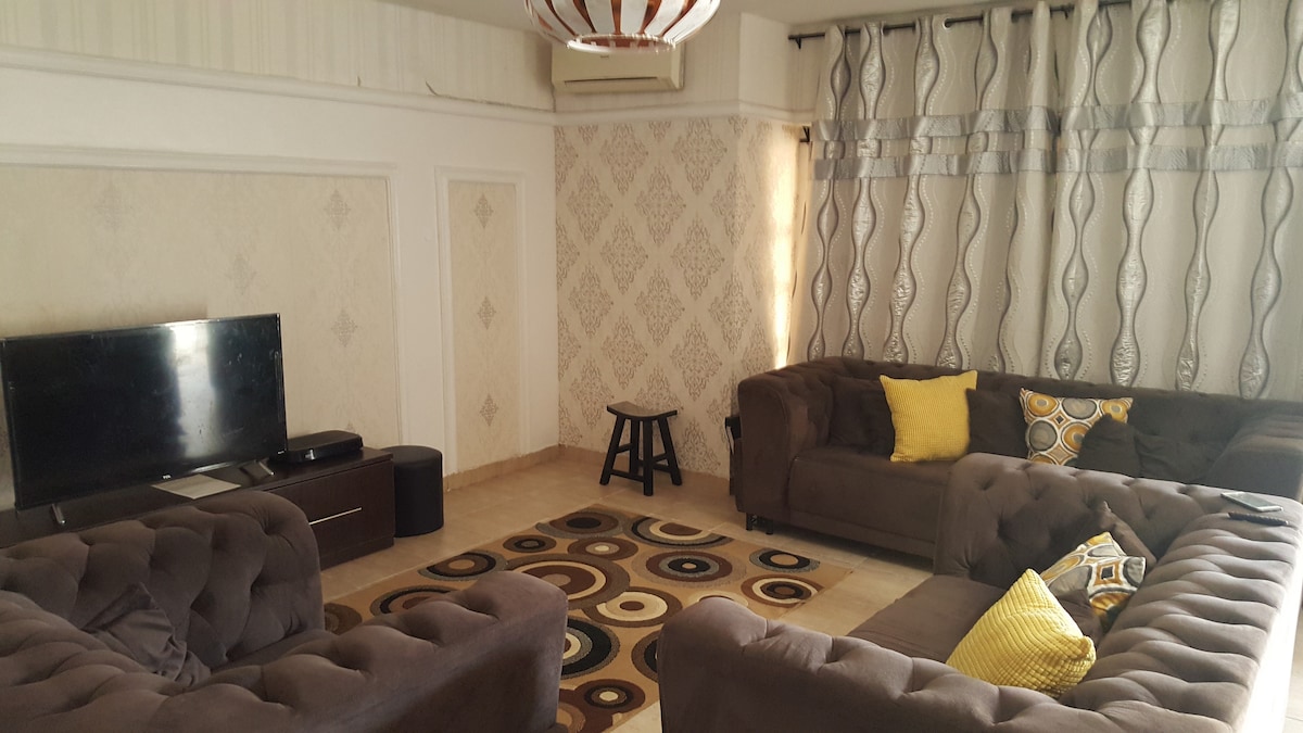 Bardzo przestronny, wygodny i funkcjonalny kamienica na osiedlu. 24/7 Power H2O 5G WiFi 2 salony 1 jadalnia 2 BR, 5AC Toaleta dla gości Kuchnia + pralka. Wstępnie załadowana karta NEPA zostanie dostarczona i pełna GENERACJA To od Ciebie zależy, jak zarządzasz mocą Wi-Fi. Fibre max Redukcja emisji CO - 24 godz. darmowa energia słoneczna, która zasila 2 klimatyzatory z falownikiem WAŻNE: zarezerwuj dokładną liczbę gości, aby uniknąć problemów, jeśli tylko 1 lub 2 osoby zarezerwowały drugi pokój Driver ONO Telewizja przemysłowa