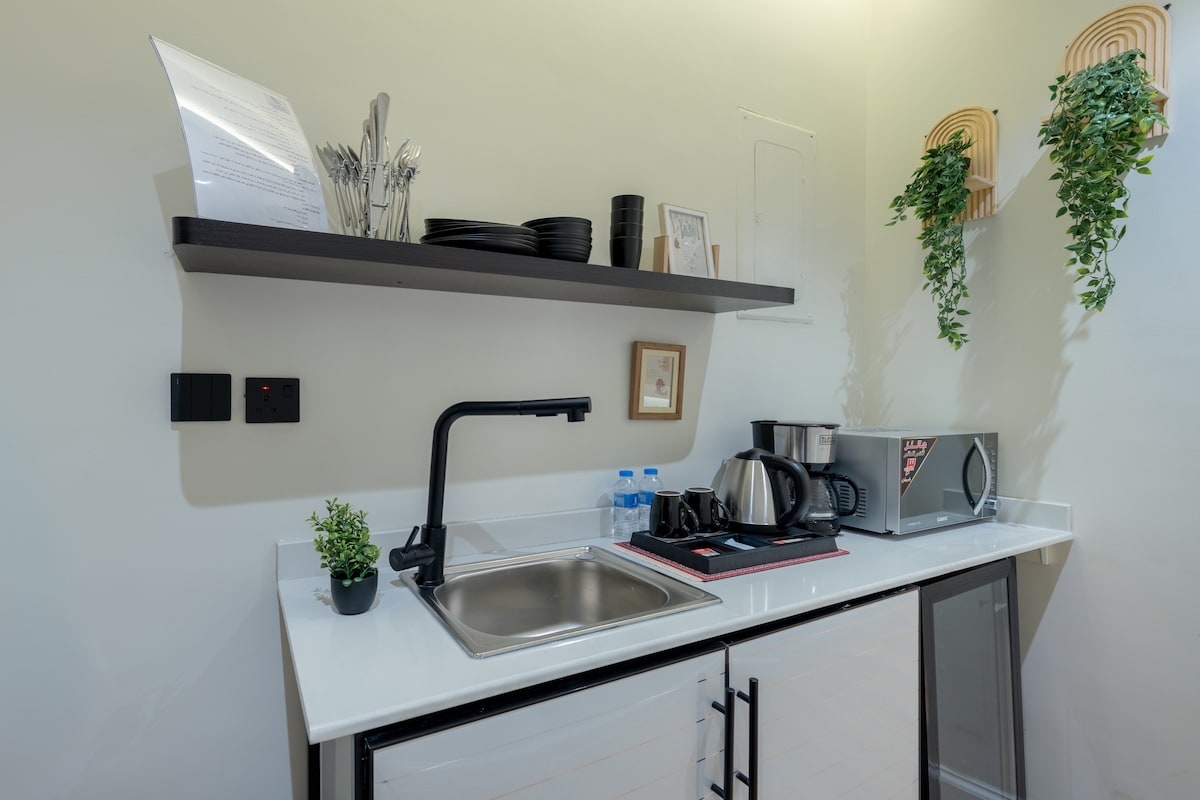 Nowoczesne mieszkanie z 2 sypialniami i prywatnym dachem w Al-Muruj w północnym Rijadzie. Na dachu znajdują się miejsca do siedzenia na świeżym powietrzu, stół bilardowy i relaksująca balia z gorącą wodą, dzięki czemu jest to idealne miejsce na odpoczynek. W środku znajdziecie stylowy salon z 85-calowym telewizorem QLED Smart TV, systemem dźwiękowym kina domowego i szybkim Wi-Fi przez światłowód. W mieszkaniu znajduje się również w pełni wyposażona kuchnia z piekarnikiem, kuchenką mikrofalową, ekspresem do kawy, czajnikiem i pralką. Idealne miejsce dla par, znajomych i na relaksujące wieczory na dachu.
