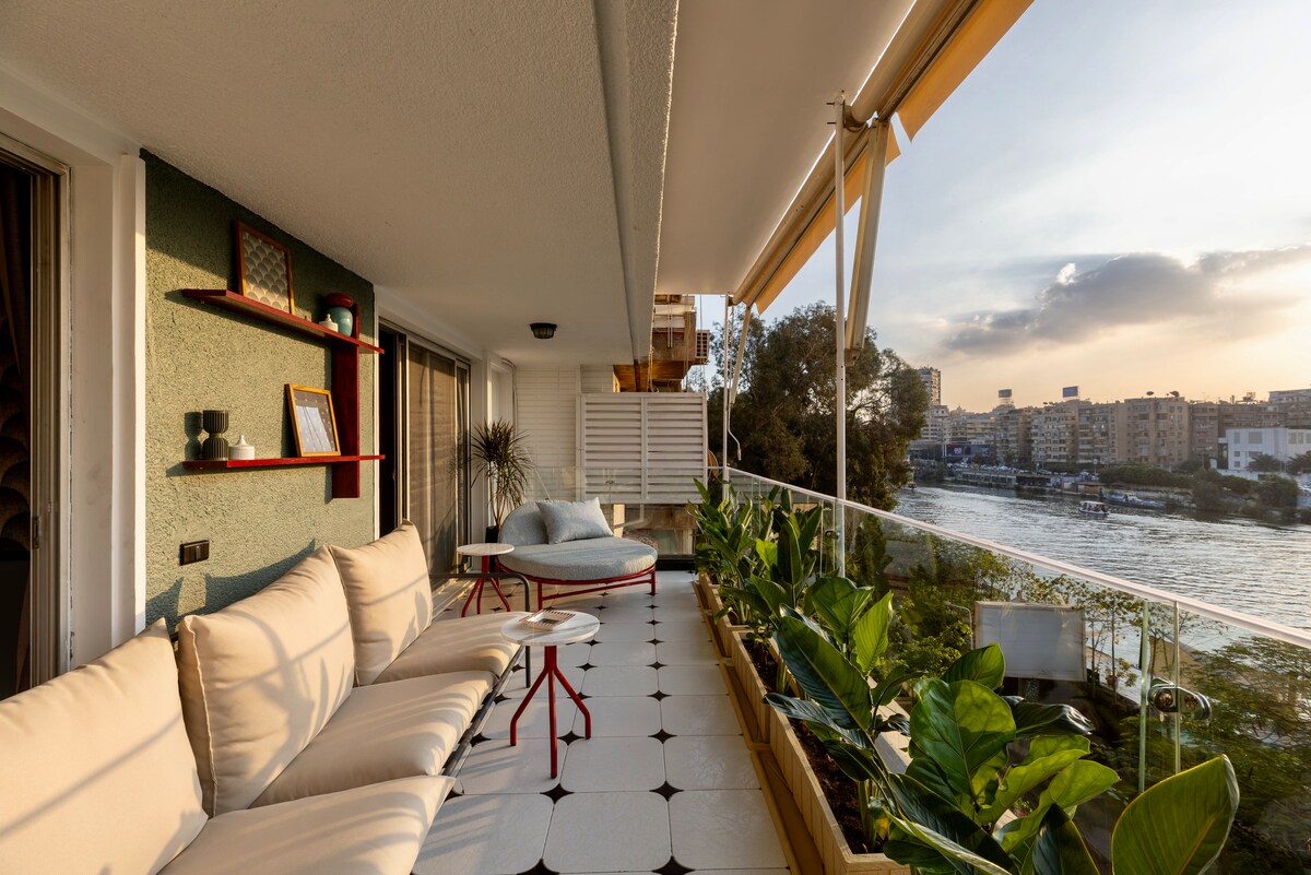 City Skyline Views: Uroczy, przytulny apartament z 1 sypialnią i 1 łazienką w Agouza. Blisko Placu Tahrir, Muzeum Egipskiego, dzielnicy Zamalek i w odległości spaceru od British Council. 64m2 Taras z pięknym widokiem na Nil i Wieżę Kairską. Jest w pełni wyposażony we wszystko, czego możesz potrzebować, świeżo odnowiony.