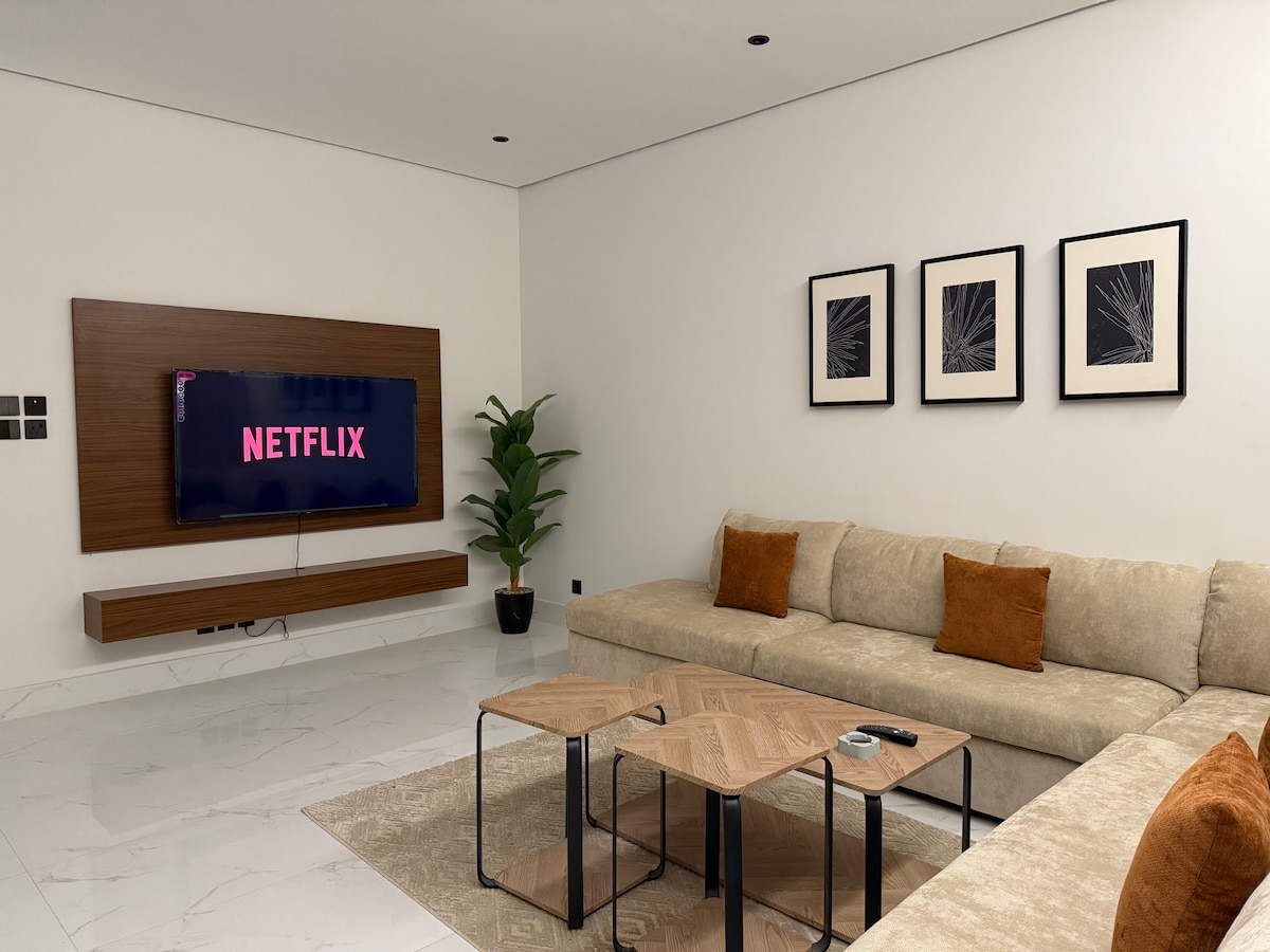 Nowoczesny apartament z sypialnią i salonem Posiada sypialnię z głównym łóżkiem z materacem hotelowym i przestronną przestrzeń z 60-calowym telewizorem Smart TV obsługiwanym przez subskrypcję Netflix Wyposażone w lodówkę, bar kawowy i herbatę Narzędzia do czajnika i herbaty W pełni wyposażona łazienka oraz bezpłatny szybki dostęp do internetu. W apartamencie panuje wysoka prywatność. W dzielnicy Al Rayyan znajduje się również winda i prywatny parking