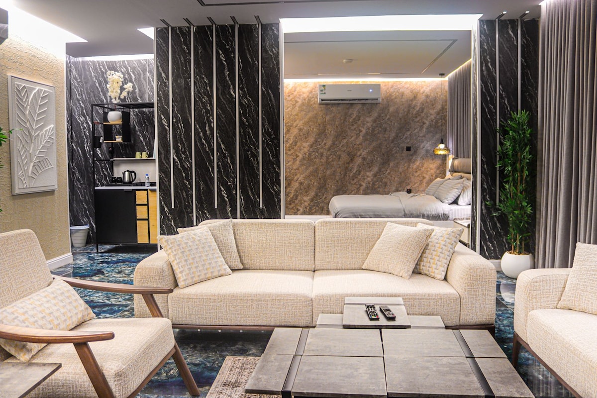 ✨ Luksusowy pobyt w obrębie kampusu cywilnego, 20 minut od Meczetu Proroka, 10 minut od Meczetu Quba, 5 minut spacerem od sąsiedniego meczetu i 20 minut od Dhu al-Hulayfah Miqat. Apartament ma ciepły, nowoczesny wystrój, luksusowe łóżko typu king z pościelą hotelową, prywatną łazienkę z prysznicem z deszczownicą, klimatyzację, telewizor Smart TV, szybki internet, lodówkę, kuchenkę mikrofalową, kącik kawowy i herbaciany, stół jadalny, duże lustro, delikatne oświetlenie, szafki, ceramiczne podłogi, prywatne wejście i zamek cyfrowy. Idealne dla par, odwiedzających, osób odbywających umrah i biznesmenów szukających komfortu, prywatności i bezpieczeństwa w pobliżu najważniejszych zabytków religijnych.