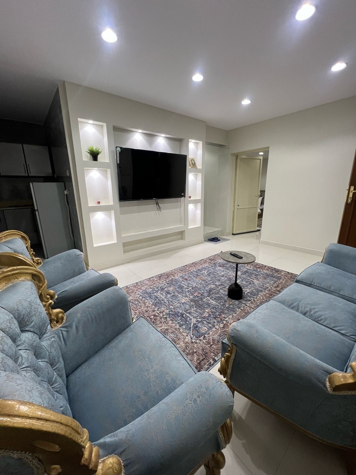 شقة أنيقة بتصميم عصري وألوان هادئة تتميز بصالة واسعة وكنب مريّح للاسترخاء يمنح المكان الراحة والفخامه