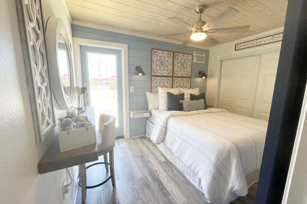 This elegant 1-bedroom, 1-bathroom residence is situated in the central hub of Gulf Shores, specifically in Moon Raker on Beach Blvd. The unit features a delightful palette of light, airy colors and tasteful beach-inspired decor. Guests are provided with a convenient street-level parking space. A grocery store, Pier 33, is just a block away, and popular dining spots, including the Hangout, are easily accessible on foot. The beach is conveniently located just across the street with dedicated access. Recently renovated, this unit showcases shiplap accents, custom ceilings, stainless steel appliances, and new flooring. It offers the added convenience of a pool and on-site laundry facilities.
