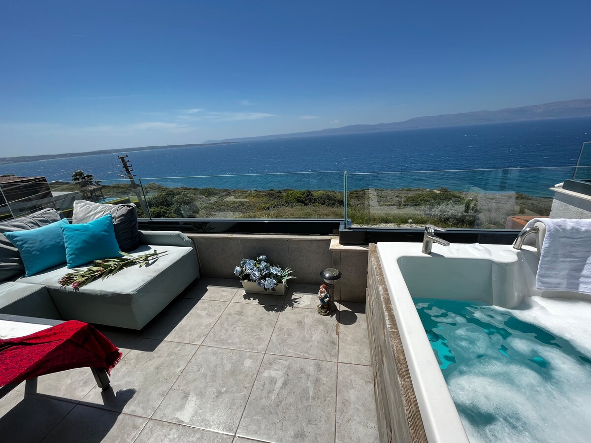 Nad morzem! Zapierający dech w piersiach panoramiczny widok na Morze Egejskie. Duży basen i fontanna wodna. Patio z tradycyjnym piecem ceglanym opalanym drewnem, a także grillem Weber Summit. Mnóstwo miejsca do siedzenia/jedzenia/gotowania. Energia słoneczna 7KW (koniec z przerwami w dostawie prądu!) Gigabit! Światłowód! 5 sypialni, 5 pełnych łazienek, w pełni wyposażona kuchnia, weranda, ogromny salon z wysokimi sufitami. Plaża Ilıca 6 min, Alacati 10 min, 4 min do HotSpring Świetny dom dla rodzin i przyjaciół szukających relaksujących wakacji.