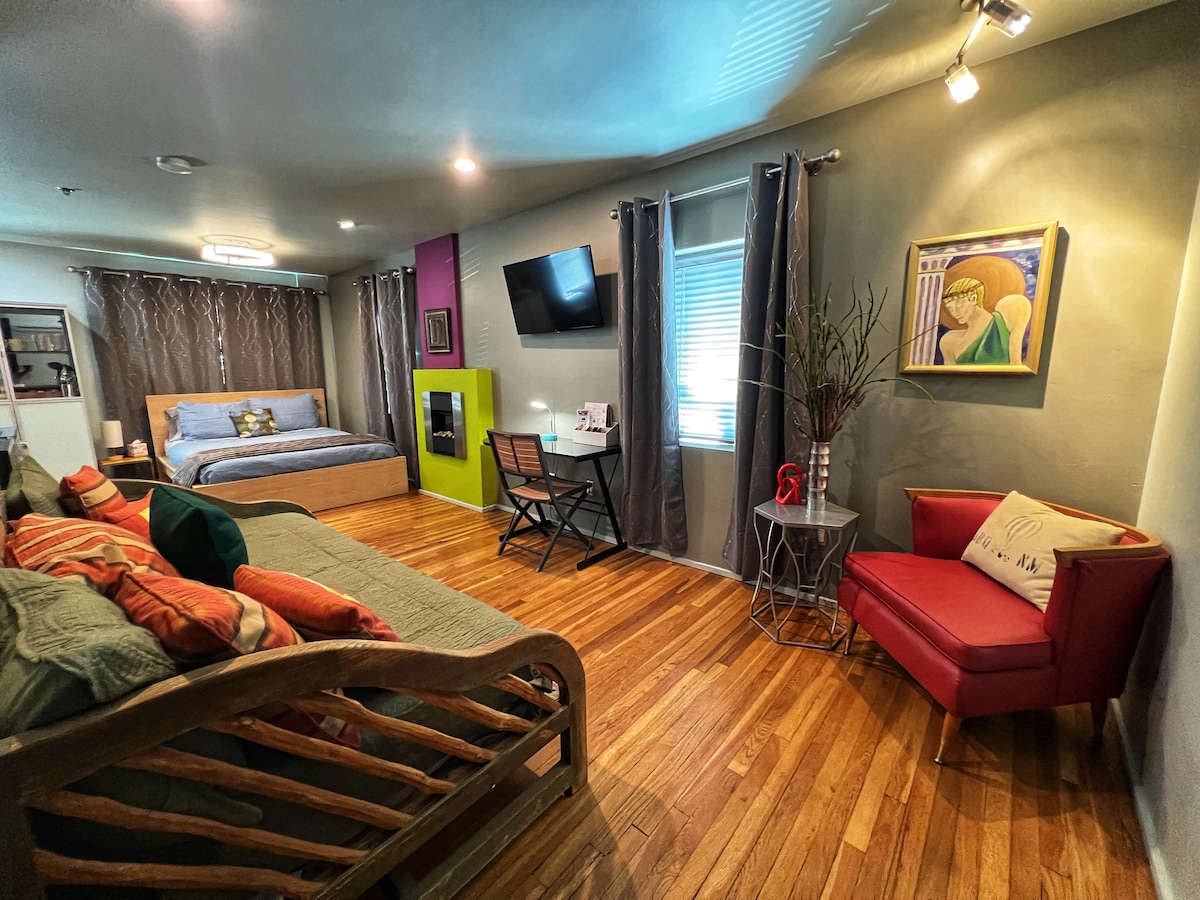 Ten rzadki garaż na dwa samochody to teraz bardzo dobrze urządzony apartament typu studio. Jest otwarty, ale zdefiniowane przestrzenie sprawiają, że czujesz się zrelaksowany, a jednocześnie świetnie sprawdza się jako baza wypadowa do zwiedzania Albuquerque i nie tylko. Do dyspozycji gości jest przytulna, ale wysokiej klasy kuchnia. Łazienka jest wielkości kieszonkowej i stylowa. Niektóre z nich sprawiają, że łazienka jest trudna. Znajduje się na północ od centrum miasta, na obrzeżach cichej dzielnicy mieszkalnej. Mnóstwo kawiarni, browarów, kawiarni w odległości spaceru