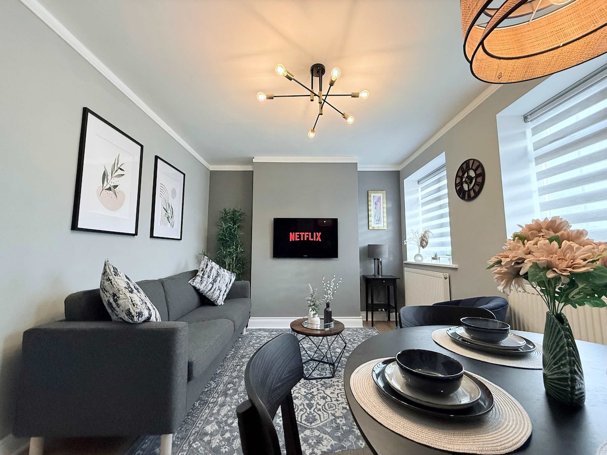 To stylowe miejsce na pobyt z dwiema sypialniami, które może pomieścić do 4 gości, jest idealne na relaks lub zabawę. Oto, co znajdziesz na miejscu: Jacuzzi Sauna Ogród prywatny Przytulna część dzienna z inteligentnym telewizorem, bezpłatnym Wi-Fi i Netflixem Dwie stylowe sypialnie z wygodnymi łóżkami i dużą ilością miejsca do przechowywania W pełni wyposażona kuchnia Nowoczesna łazienka ze wszystkimi niezbędnymi udogodnieniami Oddzielny pokój gospodarczy Bezpłatny parking Samodzielne zameldowanie/wymeldowanie Bezalkoholowe prosecco Pościel Ręczniki Szlafrok i kapcie Herbata Kawa
