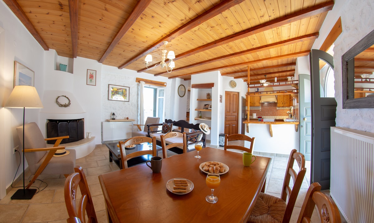 Dom zbudowany z kamienia z drewnianymi podłogami, położony na małej wyspie Kalamos, jest jasny i ma niesamowite widoki na Morze Jońskie. Posiada dwa oddzielne pokoje na najwyższym piętrze, a kuchnia i łazienka znajdują się na parterze. Kuchnia jest przestronna, z dodatkowym łóżkiem. Internet jest szybki i niezawodny (Starlink). Świeża woda jest dostarczana przez cały rok z naturalnego źródła w górach. Dom jest otoczony drzewami oliwnymi i jest idealny dla par i rodzin.