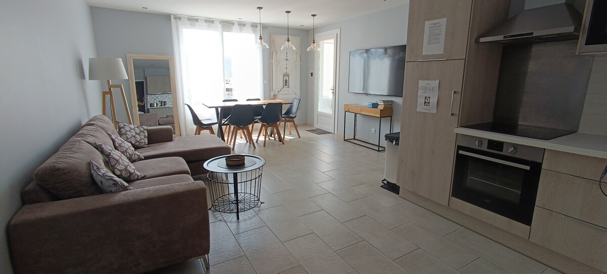 Appartement lumineux centre St Florent avec climatisation (chambre et salon), proche commerces et port, place de parking privée Terrasse ensoleillée exposée sud avec mobilier de jardi, plancha électrique Grand salon avec cuisine équipée (frigo, four, micro-ondes, lave vaisselle, plaques de cuisson, plancha), canapé convertible 2 couchages en 140 Chambre avec lit double en 140 et dressing Salle de bain avec douche cabine et machine à laver, WC séparé Couloir avec placards rangement-penderies