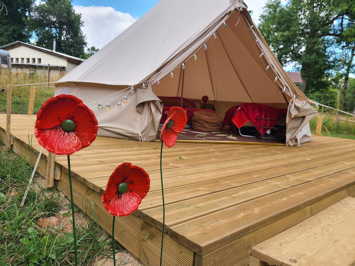 Sur une grande parcelle pour plus d'intimité, une tente de 20 M2 décorée dans un esprit zen et romantique. Jacuzzi privatif sur votre terrasse. Pour une expérience inoubliable, un braséro face au paysage champêtre pour faire griller des chamallows ( offerts) et vivre un moment romantique devant un feu sous les étoiles. Toilettes sèches sur emplacement. Salle d'eau privative à 40 mètres de la tente. Frigo avec soft drink offert. Petit déjeuner, linge de lit et de toilette, ménage sont compris