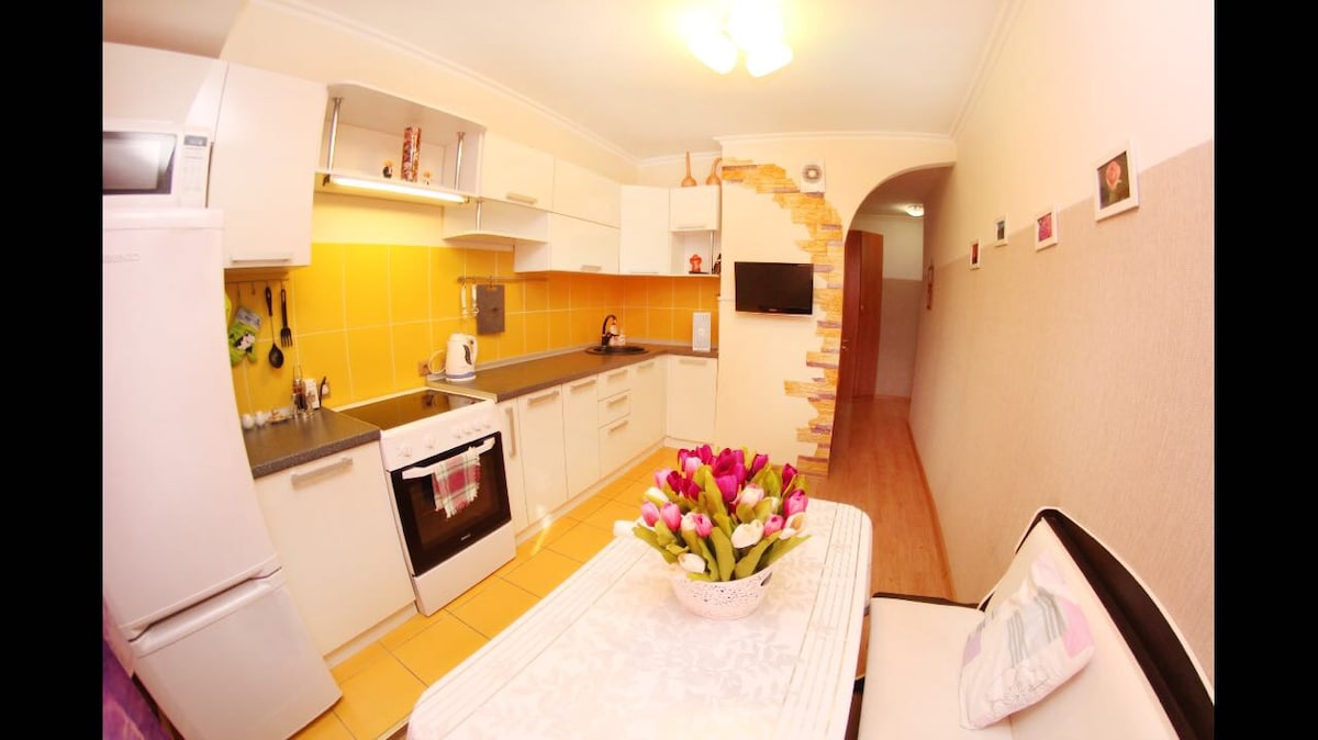Spokojne zakwaterowanie na relaksujące rodzinne wakacje. Evrodvushka znajduje się na piętrze. Aleja spacerowa z placami zabaw dla dzieci, ogrodzone mini pole do piłki nożnej, stoły do tenisa stołowego, miejsce do grillowania znajduje się dziesięć metrów od wejścia. NIGDY NIE SPÓŹNISZ SIĘ NA SWÓJ LOT. Obiekt znajduje się 5 minut od lotniska. Wygodne dla osób podróżujących z grupą do 20 osób, w jednym domu znajduje się 5 apartamentów. Możesz wynająć samochód z kierowcą.