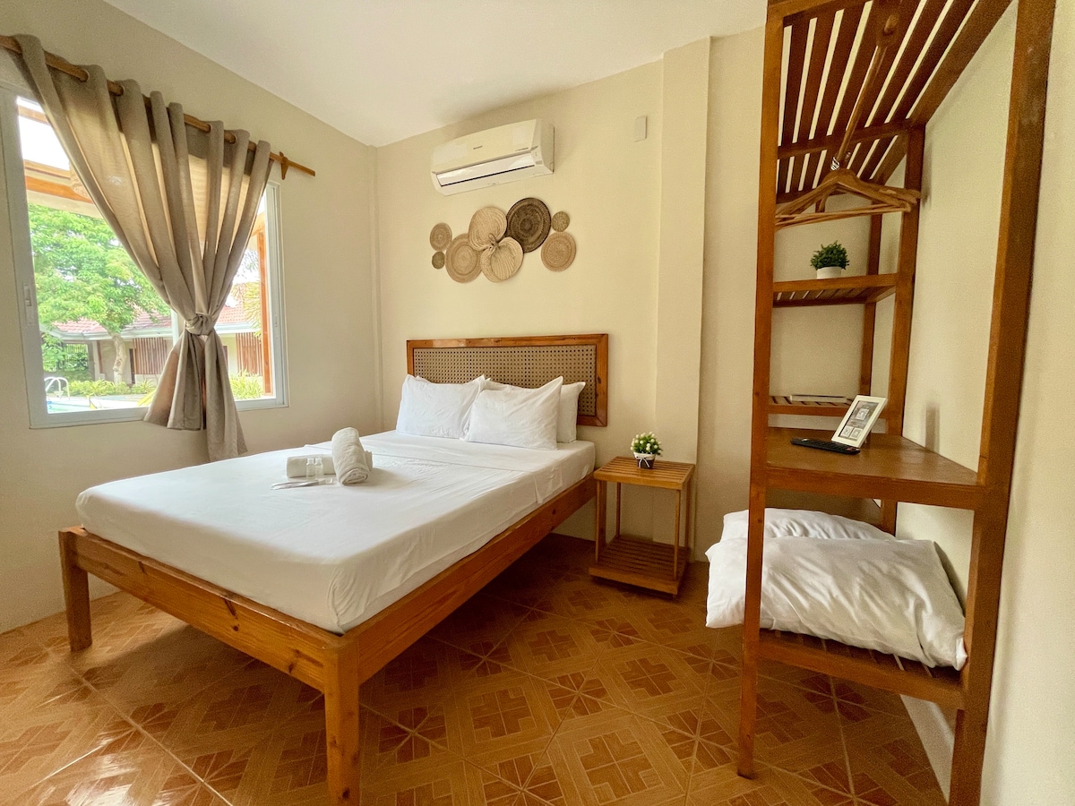 Jasny i przytulny pokój z plażowym wystrojem, idealny na wypad na wyspę! Wyposażone w dwa wygodne podwójne łóżka, klimatyzację i drewniane meble. Uroczy wystrój obejmuje grafikę ścienną o tematyce morskiej. Idealne miejsce na relaks lub jako baza wypadowa do odkrywania dziewiczych plaż i życia morskiego na wyspie Bohol. Ciesz się spokojnym, stylowym pobytem w raju!