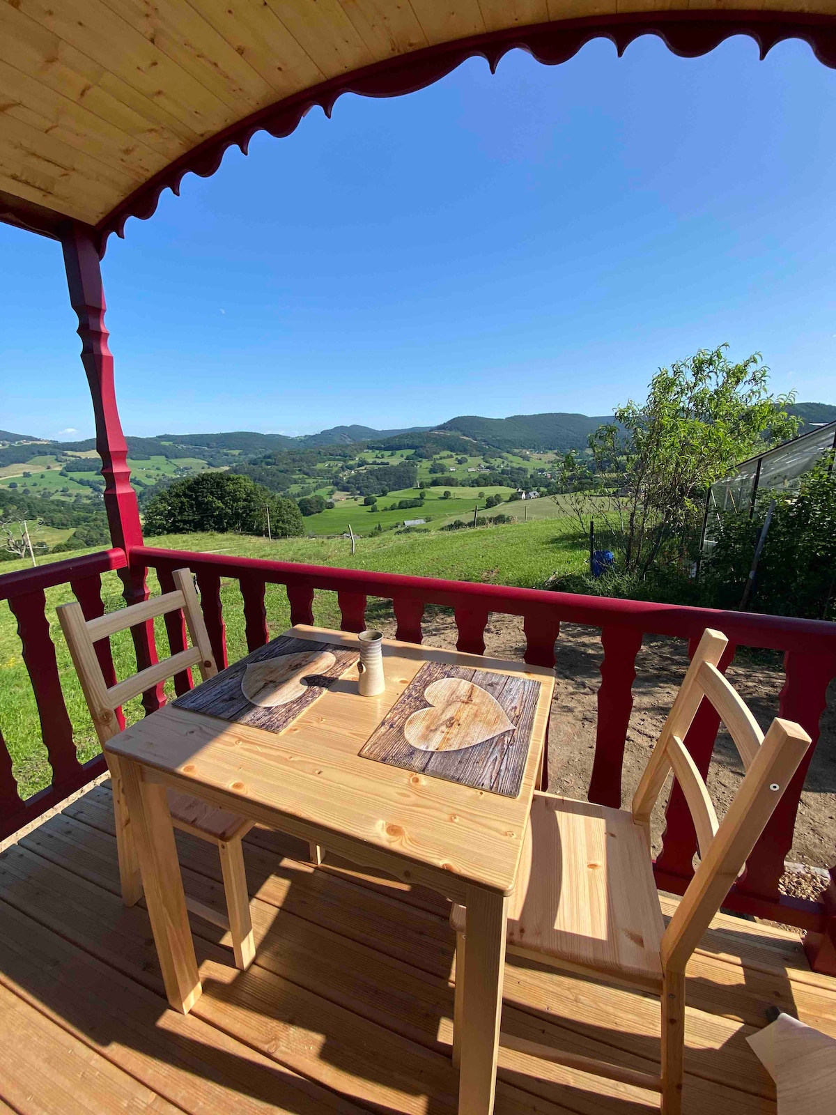 Dans un écrin de verdure avec une vue imprenable , laissez vous séduire par le confort et le charme d’une roulotte pour une escapade atypique d’un ou plusieurs jours. Elle est composée - D’un couchage en alcôve de 160/200cm. - Un coin toilette avec douche et wc. - Une kitchenette (Une plaque électrique , réfrigérateur, cafetière à dosettes) - Un petit coin salon - Une terrasse Vous pourrez également profiter de notre piscine .(disponible en été si le temps le permet)
