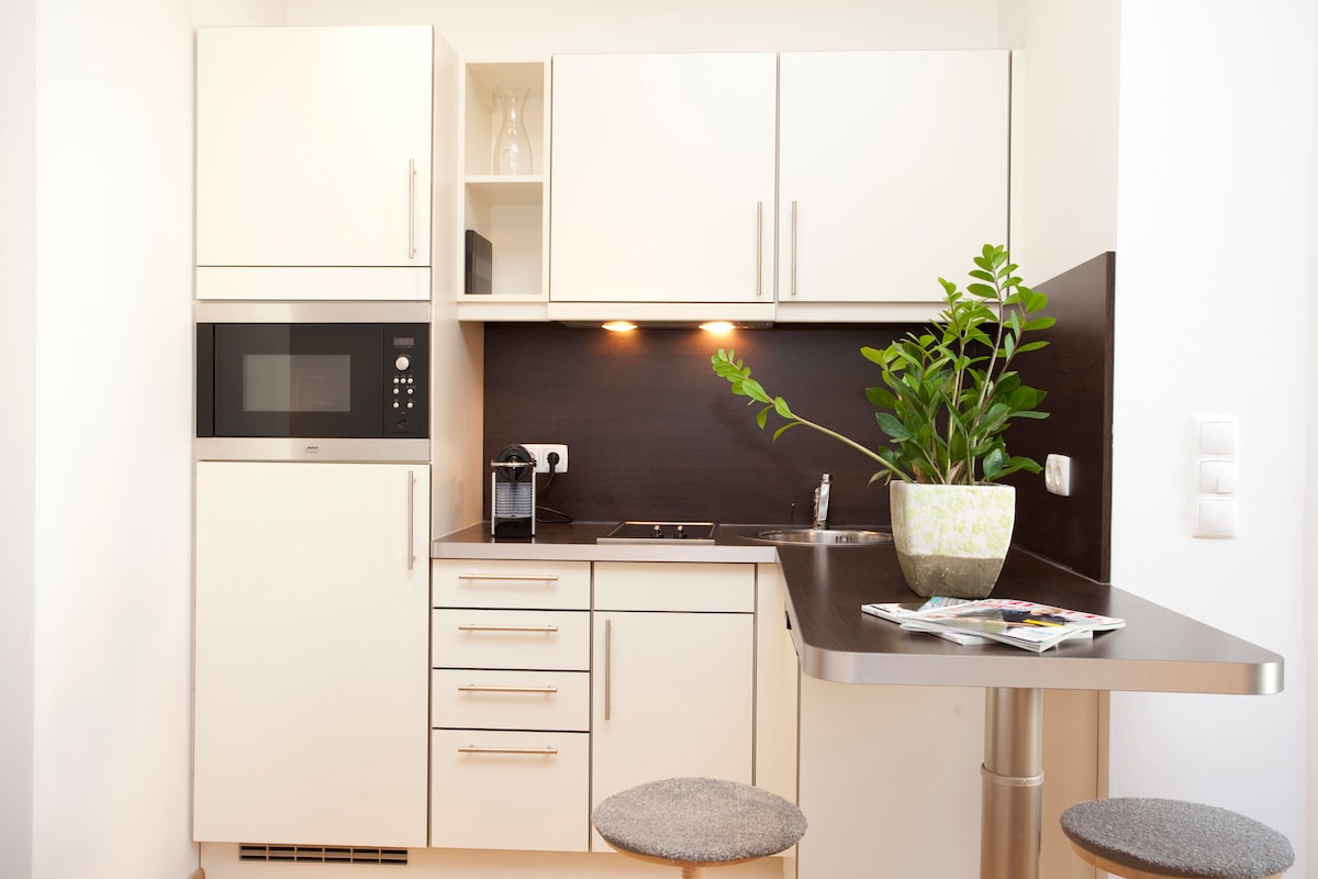 Mieszkaj w samym sercu miasta. Poznaj całkowicie odnowione mieszkanie z 1,5 pokoju z pełnym wyposażeniem i wszechstronnym, beztroskim pakietem zaledwie 10 minut spacerem od miasta. Wyposażenie i meble w mieszkaniu są zupełnie nowe i bardzo gustowne. Kuchnia jest również w pełni wyposażona w naczynia i przybory kuchenne. Nieruchomość jest obsługiwana i zarządzana przez Hotel Vienna. Należy pamiętać, że nasze zakwaterowanie będzie zamknięte od 8 stycznia do 18 marca 2024 r. z powodu wakacji firmowych.