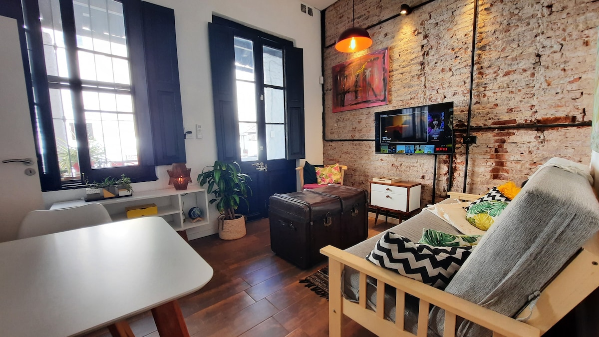 Loft de lujo en pleno Pichincha, reconocida por sus bares pintorescos y casonas de patrimonio historico. Cuenta con una cama matrimonial king size y 2 camas individuales, con opcion de colchon en el suelo. Cocina, aire central frío / calor. Cochera disponible a 40 mtos ( 12 USD la noche ). - Cambio de sabanas y toallas cada 7 dias ( si es más de 1 mes tiene costo extra) A 300 metros de La sala de las artes ( recitales) y a 800 m del Salón metropolitano ( fiestas electrónicas y recitales)