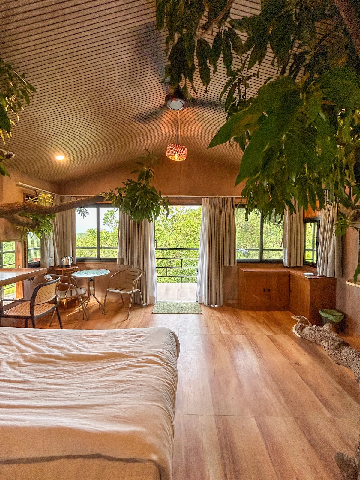 Sutra to wyjątkowy domek na drzewie, który znajduje się na drzewie mango z zapierającym dech w piersiach widokiem na dolinę i góry. W tym miejscu natura żyje razem z Tobą – samo drzewo rośnie wewnątrz pokoju. Połączenie zrównoważonego wzornictwa z nowoczesnymi udogodnieniami zapewnia komfort, urok i prywatny taras do relaksu. Idealne dla par, podróżujących w pojedynkę lub małej rodziny z trzema osobami, które szukają spokojnego wypoczynku na łonie natury.