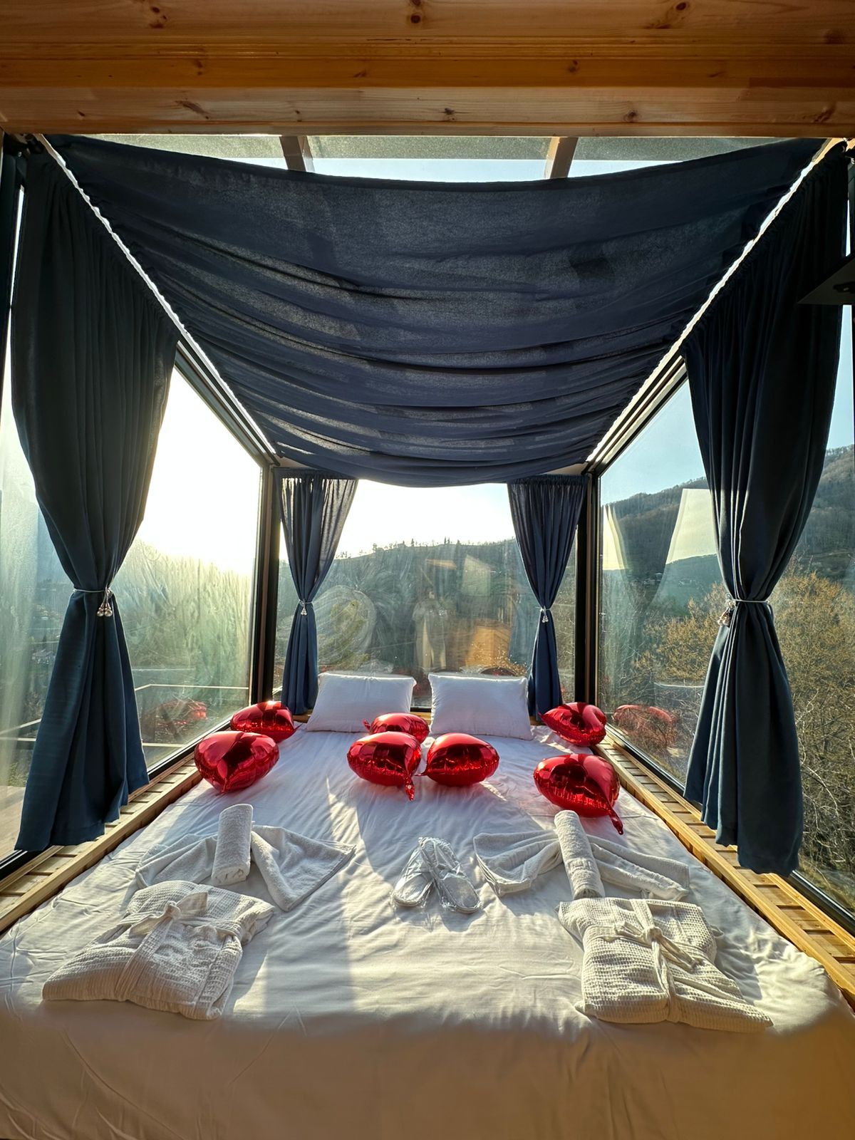 Reconnect with nature at this unforgettable escape. Welcome to our cozy cabin nestled in a green garden with stunning mountain views. Perfect for nature lovers and those seeking tranquility, our cabin offers a unique glamping experience with modern comforts. In the evenings, gather around the fireplace under the starlit sky for a memorable night of storytelling and relaxation.