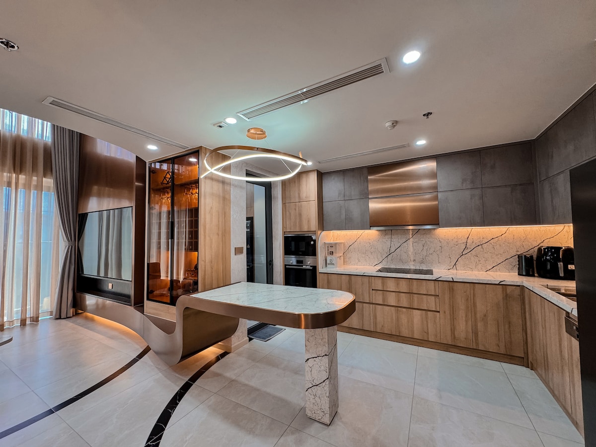 Poznaj luksusową przestrzeń w nowo wybudowanym penthousie dwupoziomowym w unikalnym stylu wabi-sabi. Ciesz się widokiem na rzekę Sajgon, most Ba Son i dzielnicę 1 przez pełnowymiarowe szklane drzwi, szczególnie piękne w nocy. • Diamentowa lokalizacja: 5-10 minut spacerem do parku nad rzeką Ba Son i stacji metra. • Luksusowe wyposażenie: fortepian, telewizor Smart TV 86", duży żyrandol, relaksująca wanna. • Przestrzeń: 3 sypialnie, pełne światła, idealne dla 4–6 osób.