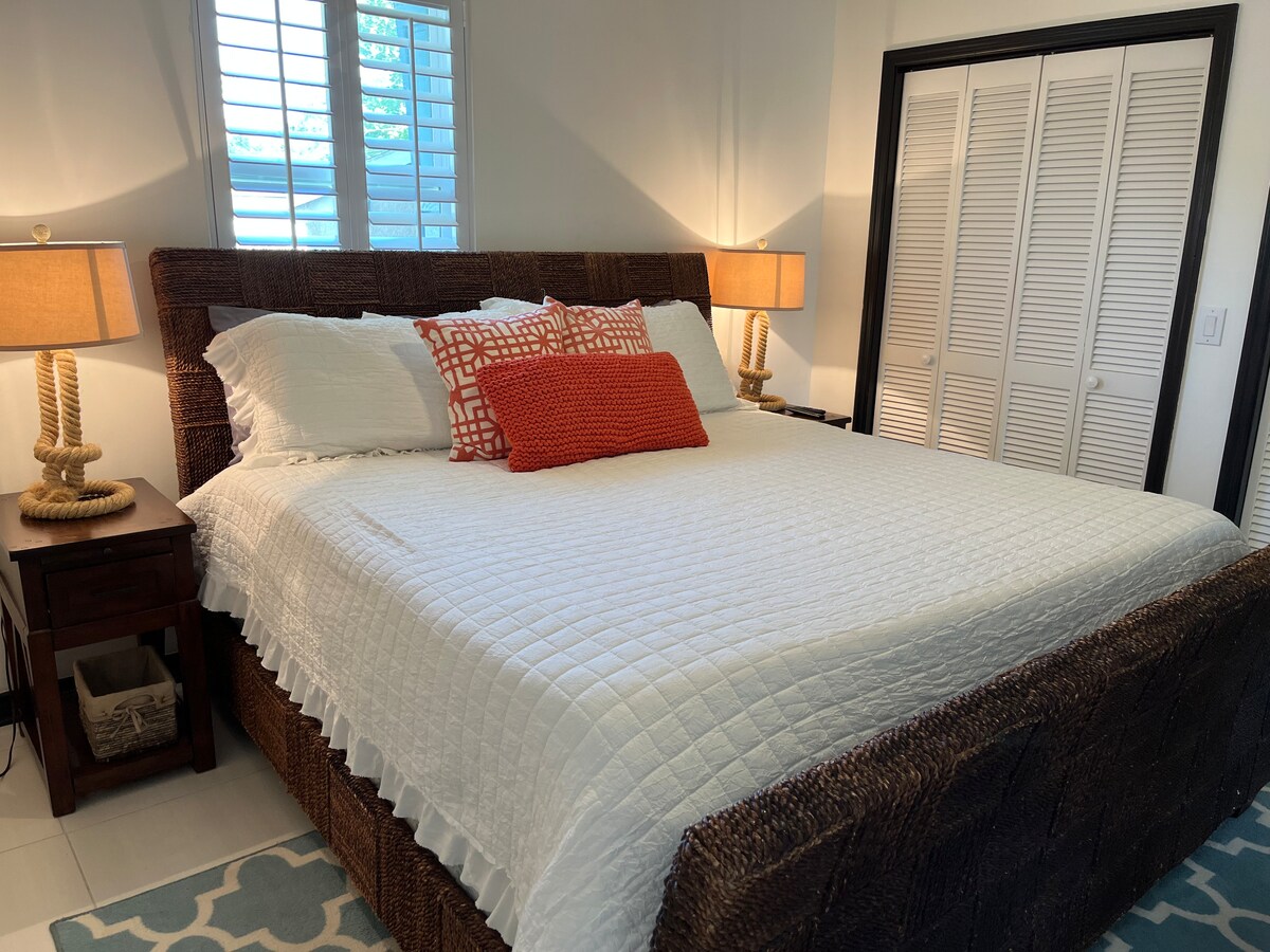 Ciesz się odkrywaniem pięknego, historycznego St. Augustine, a następnie zrelaksuj się i zrelaksuj się w tym prywatnym, cichym kurorcie plażowym w odległości krótkiego spaceru od plaży. Oddzielne wejście bez klucza umożliwia samodzielne zameldowanie. Łóżko typu Queen size, w pełni umeblowane, z udogodnieniami, w tym ekspres do kawy Keurig, żelazko, suszarka do włosów, rowery plażowe, leżaki, ręczniki, parasol i grill gazowy do gotowania. Telewizory z płaskim ekranem zarówno w salonie, jak i sypialni z Netflix i Amazon Prime oraz bezpłatnym Wi-Fi