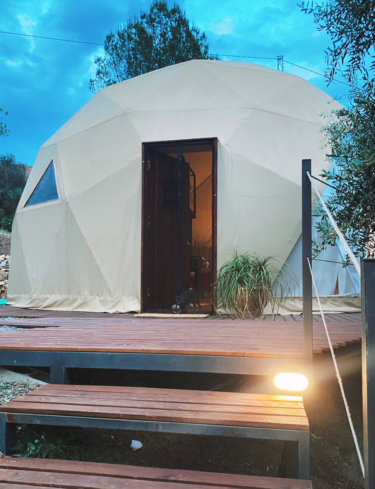 Nasza najpopularniejsza przestrzeń wypadowa! Odosobniona w obrębie drzew i naturalnej fauny leży Geo-Dome z dużą ilością otaczającej przestrzeni do leżenia na słońcu, obserwowania gwiazd lub zrzucania hałasu współczesnego życia. Kopuła zbudowana jest na drewnianej platformie z sąsiednim otwartym tarasem ze stolikiem i wszystkimi udogodnieniami, aby rozkoszować się wyjątkowym posiłkiem. Prysznic na zewnątrz, lustro i toaleta w stylu marokańskim. (Tak, oznacza to kucanie tak jak w dawnych czasach!) i znajduje się zaledwie 50 metrów od głównego domu gościnnego