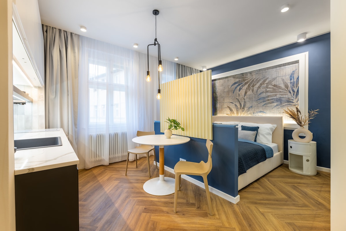 Wędruj ulicami Pragi z niesamowitej lokalizacji w pobliżu Teatru Narodowego, gdzie poczujesz się jak w filmie! Nasz apartament z akcentem designu wyposażony jest w łóżko typu queen size i piękny dziedziniec, więc znajduje się na parterze. Zapewniam nie tylko apartament, ale także pomocne przewodniki, które stworzyłem dla moich drogich gości!