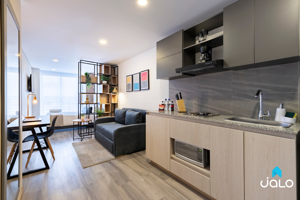 Luksusowy apartament o powierzchni 74 m2 z pełnym zakresem usług. Śniadanie serwowane w apartamencie, siłownia, basen z jacuzzi na tarasie budynku, wypożyczalnia rowerów i sale konferencyjne, całodobowa recepcja. Apartament położony jest naprzeciwko parku El Virrey, w jednej z najlepszych dzielnic miasta, zaledwie 5 minut od strefy T, gdzie można znaleźć ekskluzywne restauracje, bary, banki, supermarkety, klinikę El Country, ulicę projektantów, centra handlowe, takie jak Andino.