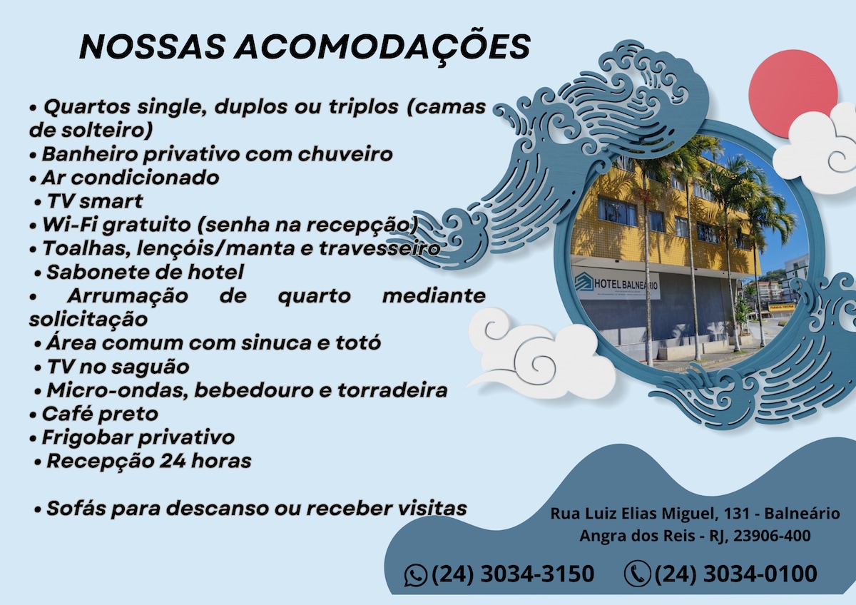 Hotel localizado no centro de Angra, a duas quadras do cais de embarque para passeios nas ilhas. Próximo de restaurantes, bares, bancos e a 1 km da rodoviária.