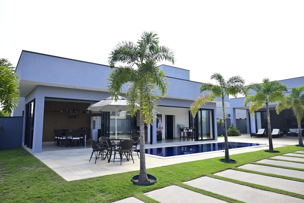 relaxe neste lugar único e tranquilo. 2 suítes 2 quartos 2 banheiros externos área de festa ampla cozinha piscina 12 MTS area cercada represa dentro condomínio rampa de acesso ao rio para barcos e jet ski água poço artesiano etc.possui 9 camas solteiro, 4 camas de casal,2 beliches,4 colchões solteiro plastificado.