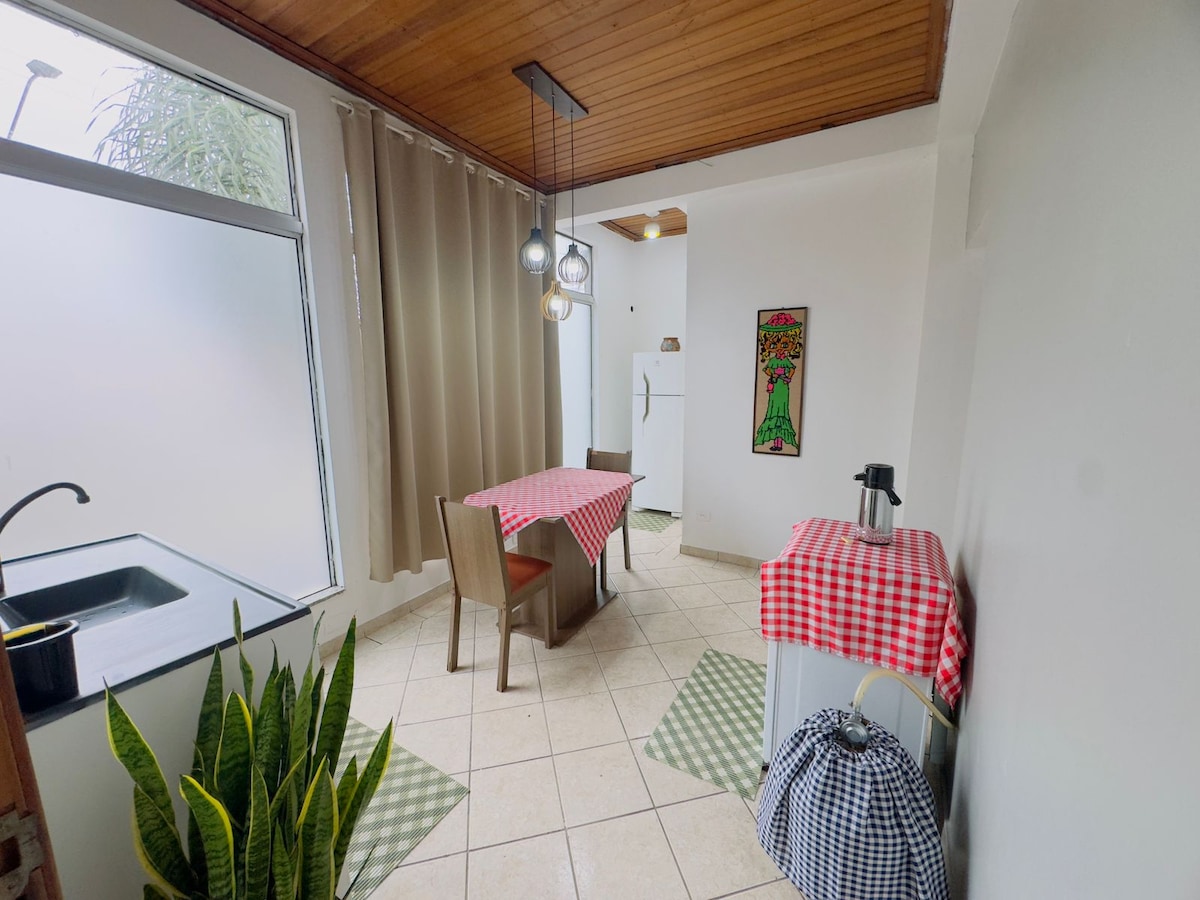 Kitnet 6 znajduje się w uroczym Alfa Residencial. Poza tym, że jest bardzo dobrze położone, w pobliżu targowisk, HR Hospital, restauracji, banków i słynnego Parku Ludowego. W obiekcie znajduje się 1 klimatyzowany pokój, 1 łóżko typu Queen, telewizor Smart TV 43'. Oferujemy pościel i kąpiel. W kuchni znajdują się wszystkie niezbędne podstawowe przybory na czas Twojego pobytu. Nie ma dostępnego garażu, ale jest to całkowicie cicha i bezpieczna dzielnica Presidente Prudente.