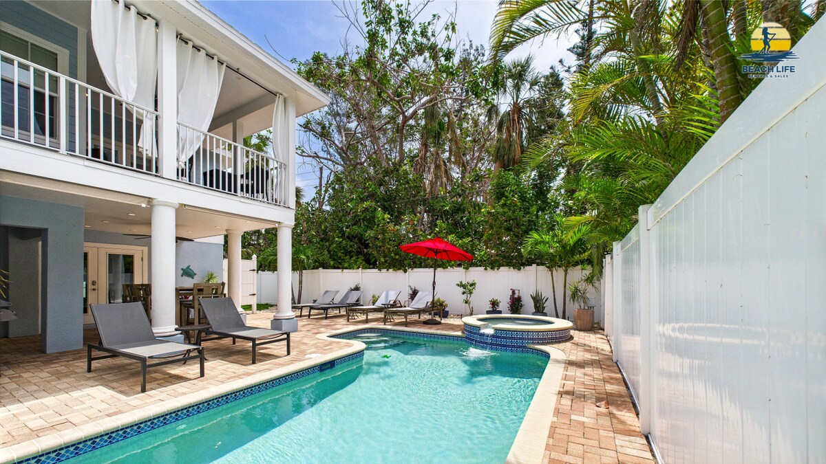 Spędzaj czas na zabawie w basenie i opalając się w tym nadmorskim domu! Ogromny, osłonięty werandą basen z podgrzewaną wodą morską, spa i tarasem słonecznym oraz duży zadaszony salon i jadalnia. Odnowione wnętrze z 3 sypialniami i 2 łazienkami jest jasne i przestronne, z dużą ilością naturalnego światła. Prawie każde pomieszczenie wychodzi na basen. Położony w spokojnej okolicy z szybkim dostępem do plaż AMI, IMG, szlaków spacerowych, parków, sklepów i restauracji!