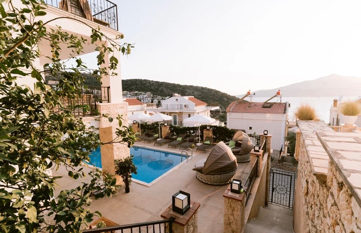 This suite house with a nice pool (shared) offers a quiet and peaceful stay along with a great view. The house is 600m to the beach and a few minutes to the center. Eşsiz Kaş manzarasi ve havuzlu suite villamiz sizi bekliyor. Ev, ferah ve huzurlu bir tatil icin harika bir ortam sunuyor. Ayni zamanda konum olarak sahile ve Kaş merkeze de ulasim kolayligina sahiptir. Villa hem aileler, hem de arkadas gruplari icin idealdir.