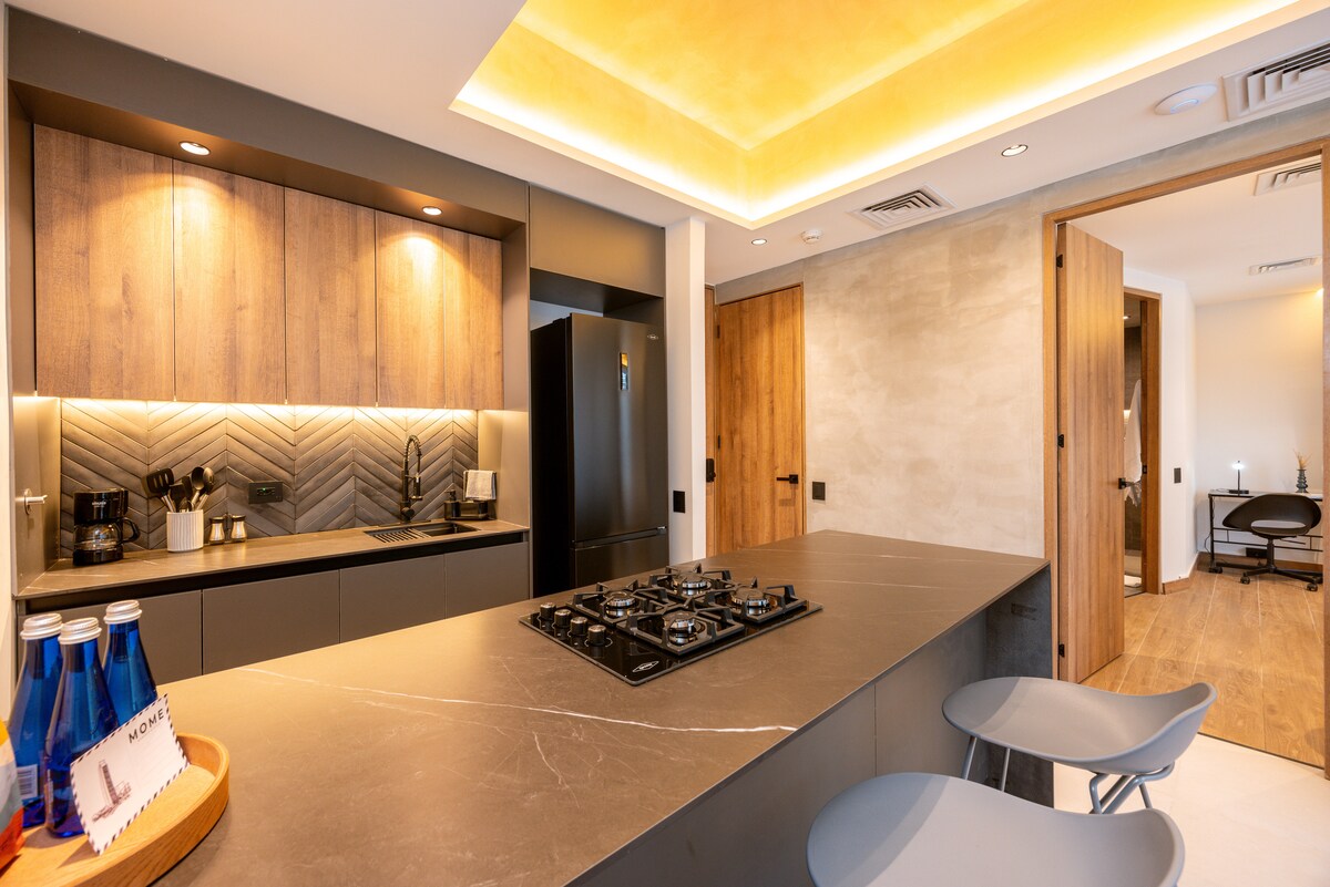 Apartament posiada dużą sypialnię i pełną łazienkę z ciepłą wodą. Możliwość komfortowego spania dla 2 osób z łóżkiem typu king size i dużym salonem z sofą, dużym telewizorem z płaskim ekranem, szybkim internetem internetem Wi-Fi, pralką/suszarką, kuchnią i lodówką. Apartament posiada duży balkon z miejscami do siedzenia na świeżym powietrzu i stołem dla 6 osób. Ochrona 24h. Na dachu znajduje się basen typu infinity, jacuzzi, sauna i siłownia.