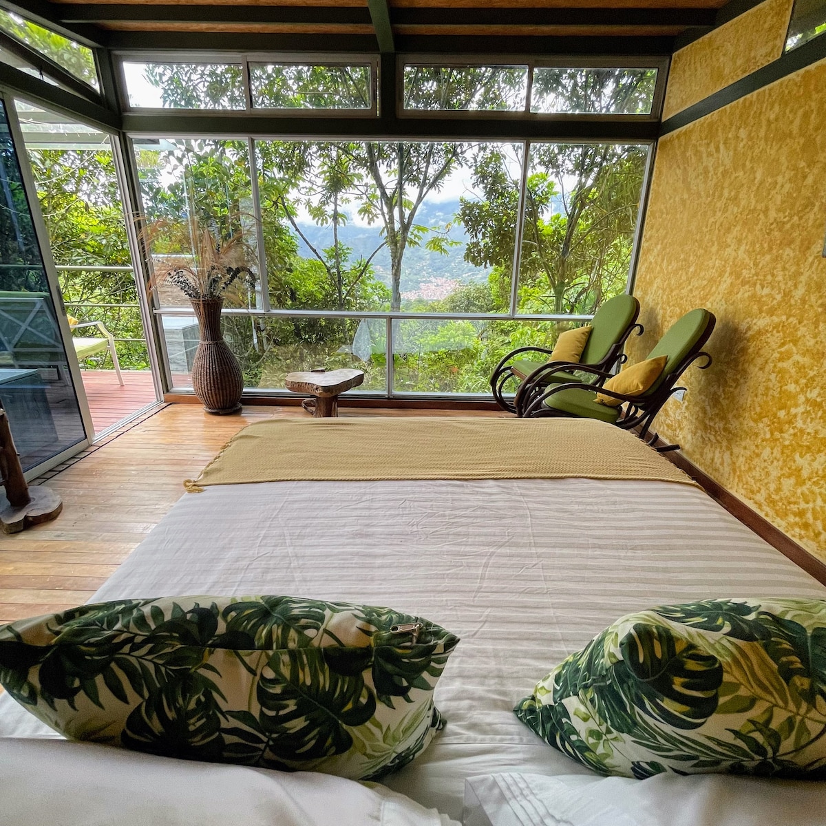 Uroczy domek na drzewie | Jacuzzi z widokiem na jezioro Poczuj się jak w raju w naszym przytulnym domku na drzewie z 2 sypialniami w Atma Villas w Guatapé. To wyjątkowe miejsce z zapierającymi dech w piersiach widokami na zbiornik El Peñol oferuje łóżko typu queen, dwa pojedyncze łóżka, dwie łazienki, jacuzzi na świeżym powietrzu i prywatny taras. Wypij kawę Nespresso, zrelaksuj się przy palenisku lub nadrób zaległości w pracy przy biurku. W cenę wliczone są powitalne upominki i śniadanie à la carte. Idealne dla rodzin lub znajomych.