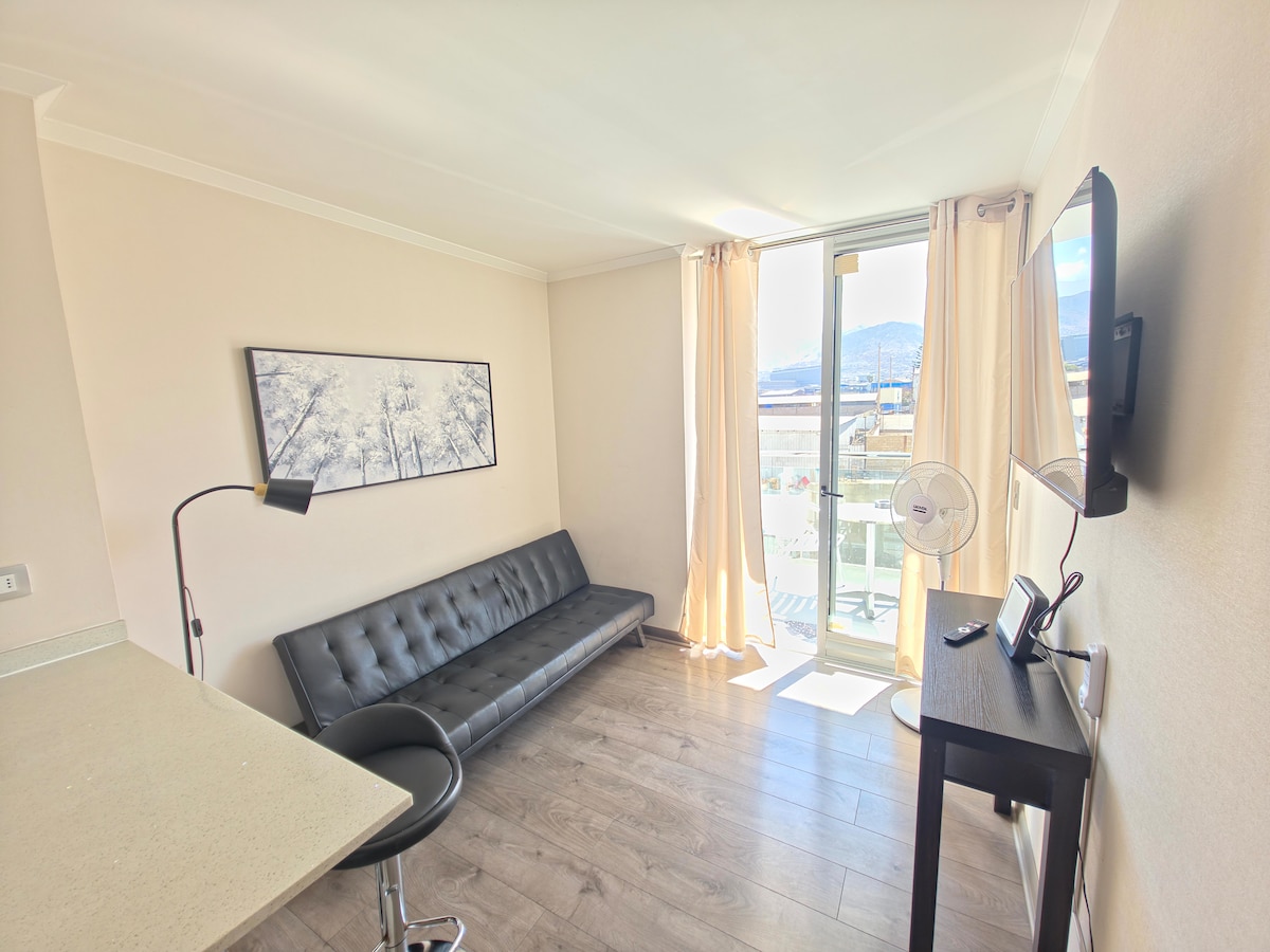 Jest wynajmowany na dzień z 1 pokojem na 7 piętrze z widokiem na południe, w pełni wyposażonym i nowym w condominium north hills I, północnym sektorze Antofagasta. -1 sypialnia i salon z pilotem. -1 łazienka. - W pełni wyposażony aneks kuchenny. - Kabel i internet. - Taras z loggią. - Parking podziemny. -Counseling and security 24 h. - Tereny zielone, zabawa dla dzieci, baseny, quincho, rower W pobliżu supermarketów, lokomocji, siłowni, szkół, biznesu i następnego centrum handlowego 1 przecznica.