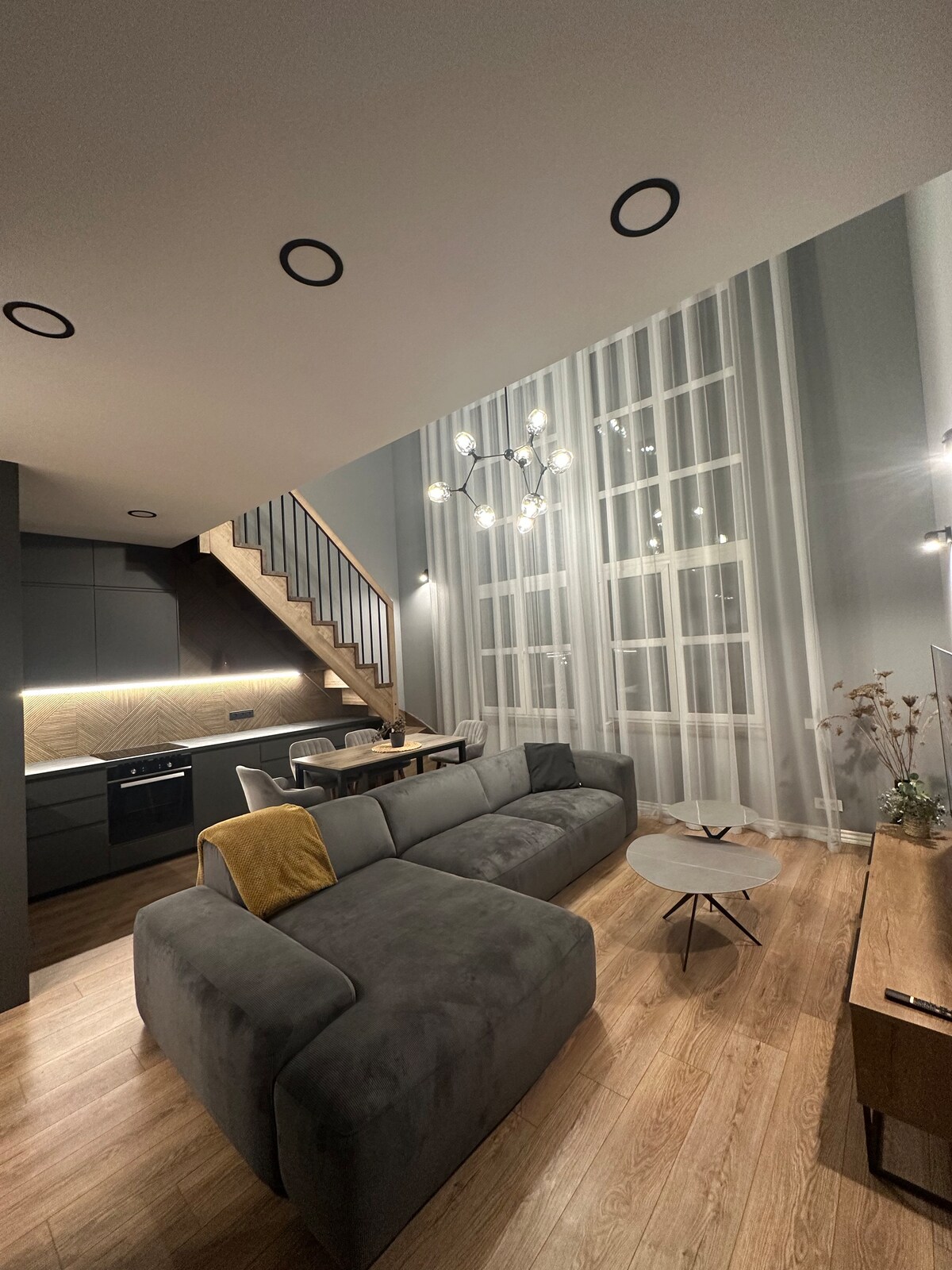 This stylish two-level loft offers a perfect blend of modern design and comfort. High ceilings and large windows create a bright, spacious feel, while the cozy living area is ideal for relaxing after a long day. The fully equipped kitchen and dining space make it easy to feel at home. Upstairs, a comfortable bedroom ensures a restful night’s sleep. Ideal for couples, solo travelers, or business stays.