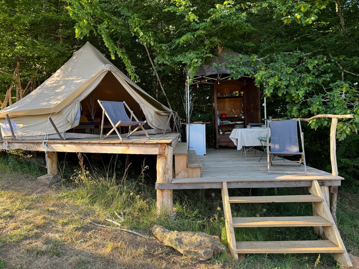 Du 1 mai à la fin de sepembre, glamping à la lisière de la forêt, en dessous de notre petit hameau privé, sur un domaine de 8 ha avec vue sur les prairies et les forêts. Tente entièrement équipée pour deux personnes. Dans le hameau, nous vivons nous-mêmes à deux avec nos animaux. Nous louons également une petite maison d'hôtes pour deux personnes.